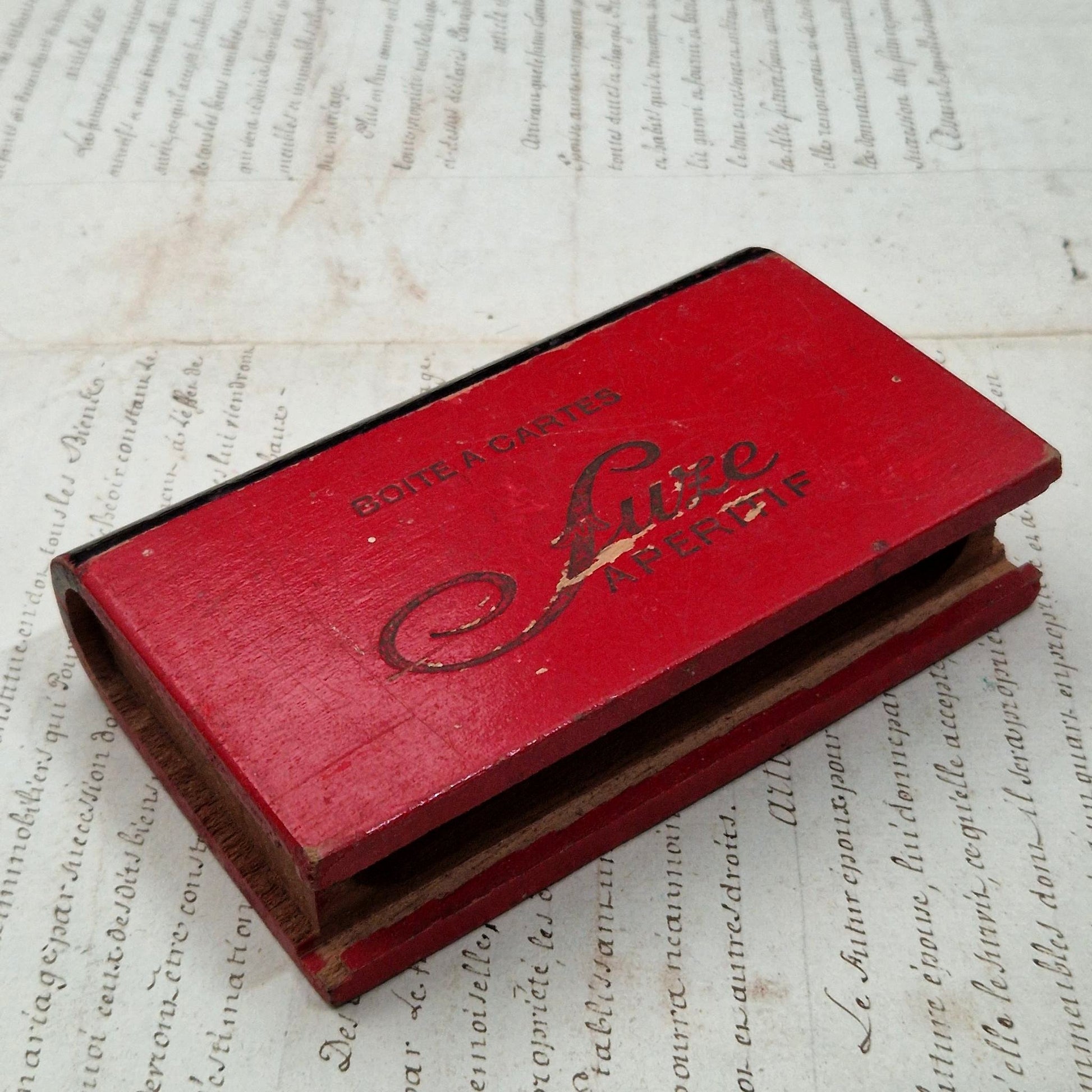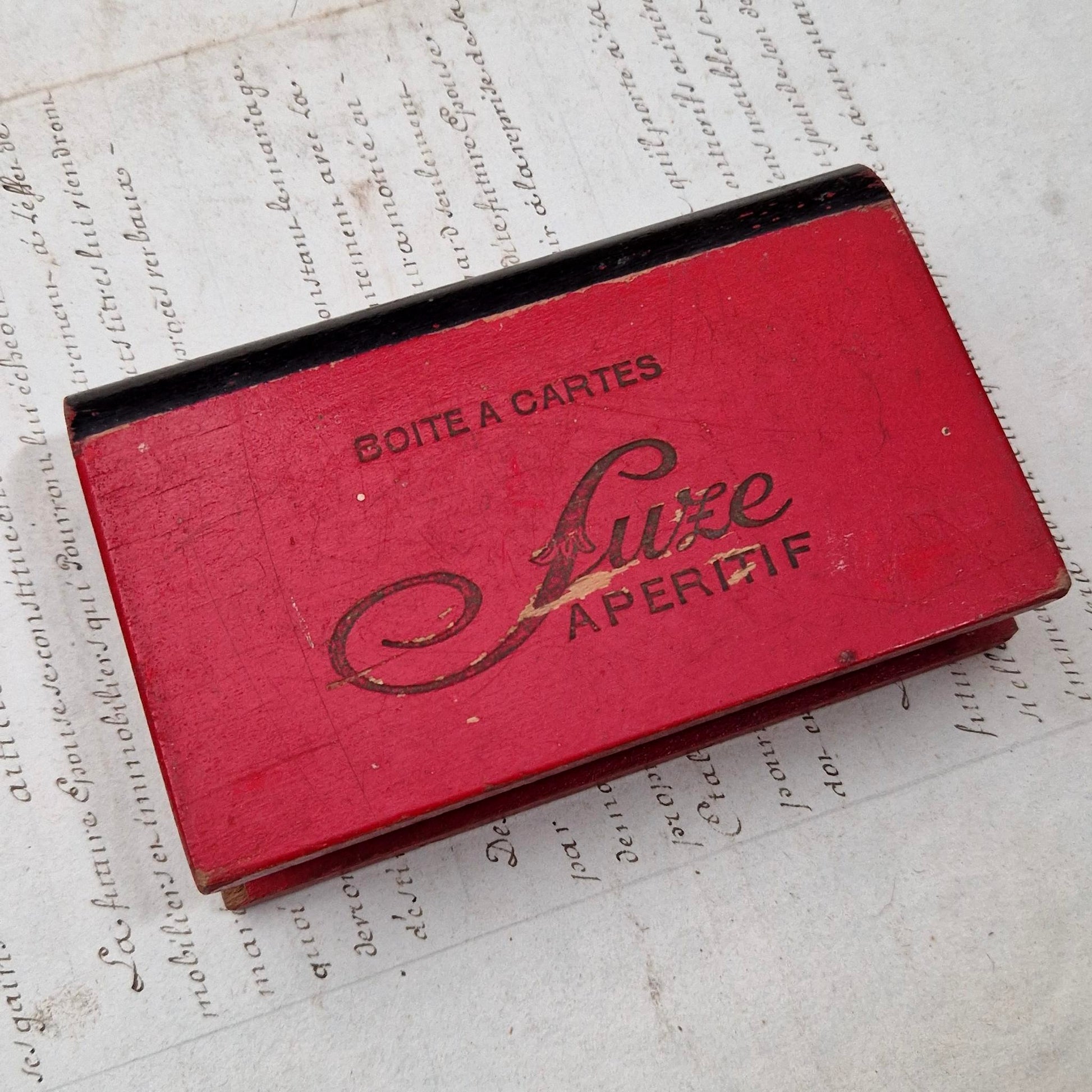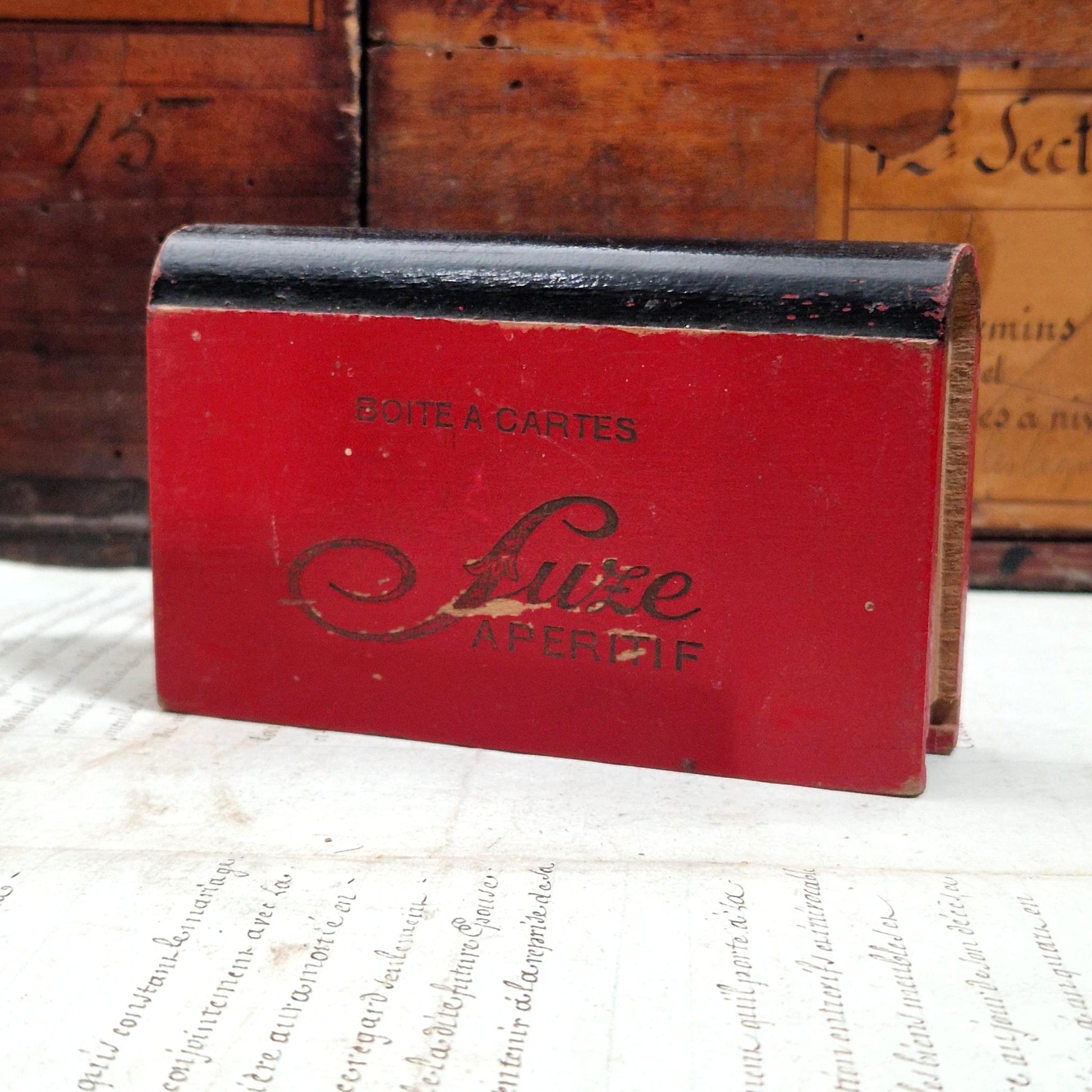 Boîte à cartes publicitaire en bois laqué rouge pour la marque SUZE, arborant la mention « BOÎTE À CARTES » et le célèbre logotype « Suze Apéritif » dans sa version script élégante. Ce type d’objet était destiné aux tables de cafés et bistrots, servant à la fois de rangement pour les jeux de cartes et de support publicitaire. La finition rouge vif, aujourd’hui largement patinée avec des zones d’usure laissant apparaître le bois, témoigne d’un usage prolongé en contexte réel.