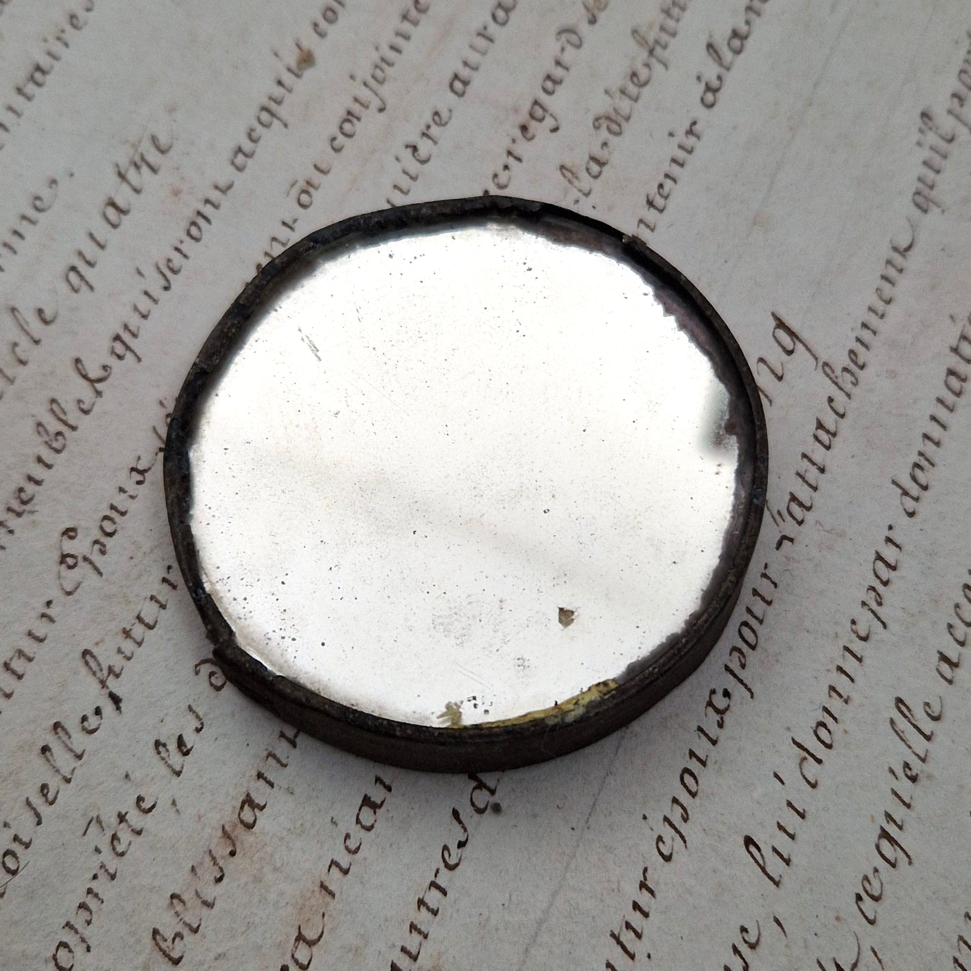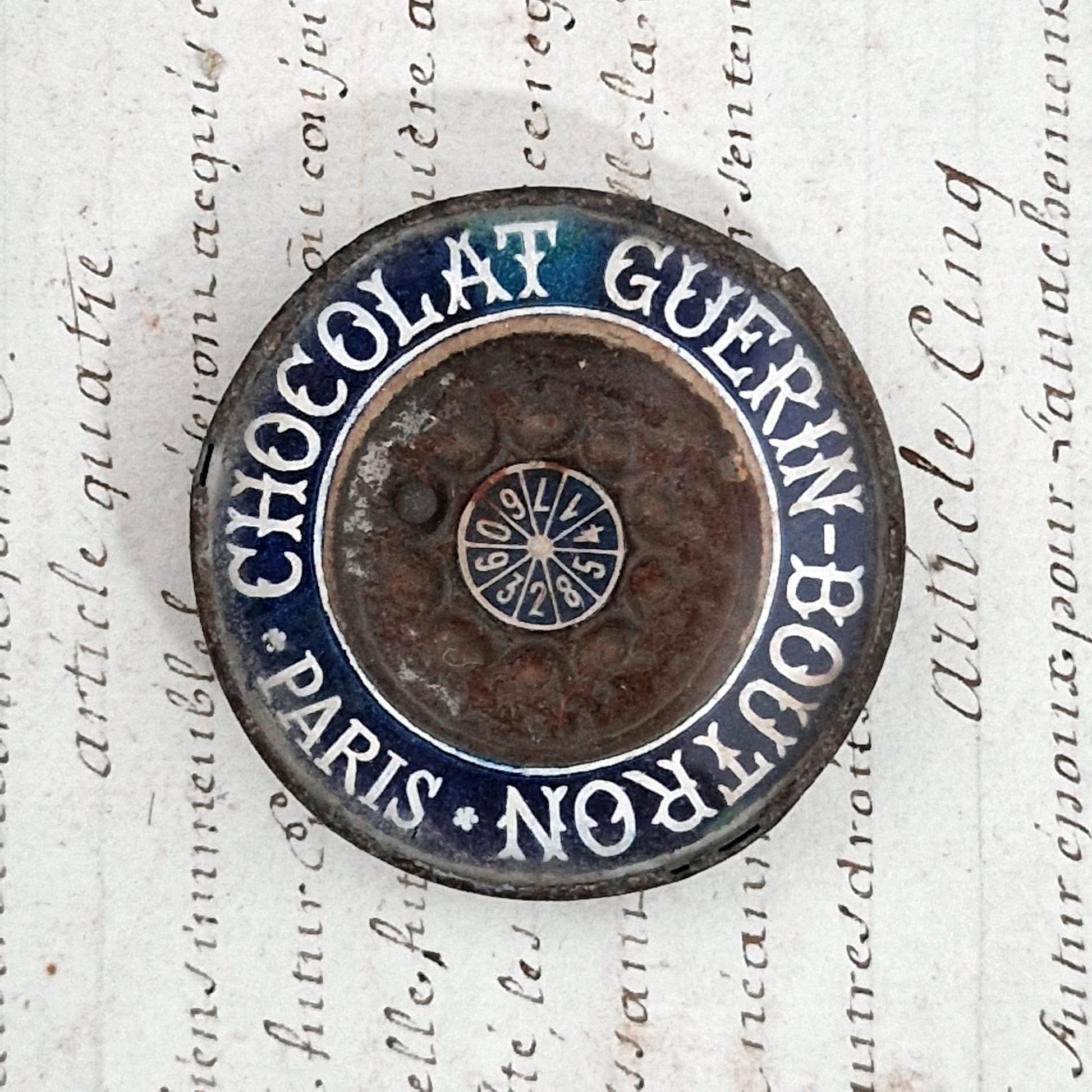 Petit jeu de hasard publicitaire en métal et verre aux couleurs de la maison Chocolat Guérin-Boutron à Paris. Ce disque renferme une petit bille de plomb avec une roue numérotée permettant d’obtenir un résultat aléatoire, dans l’esprit des jeux de comptoir ou d’animation commerciale de la Belle Époque. De l'autre côte se trouve un miroir de poche. Ces objets étaient utilisés comme supports promotionnels ludiques pour attirer la clientèle, mêlant publicité et divertissement dans un format compact.