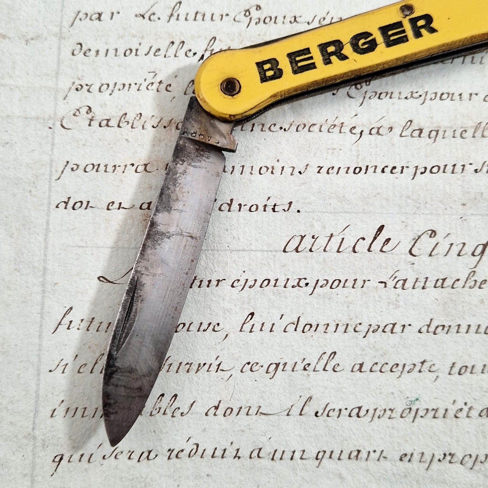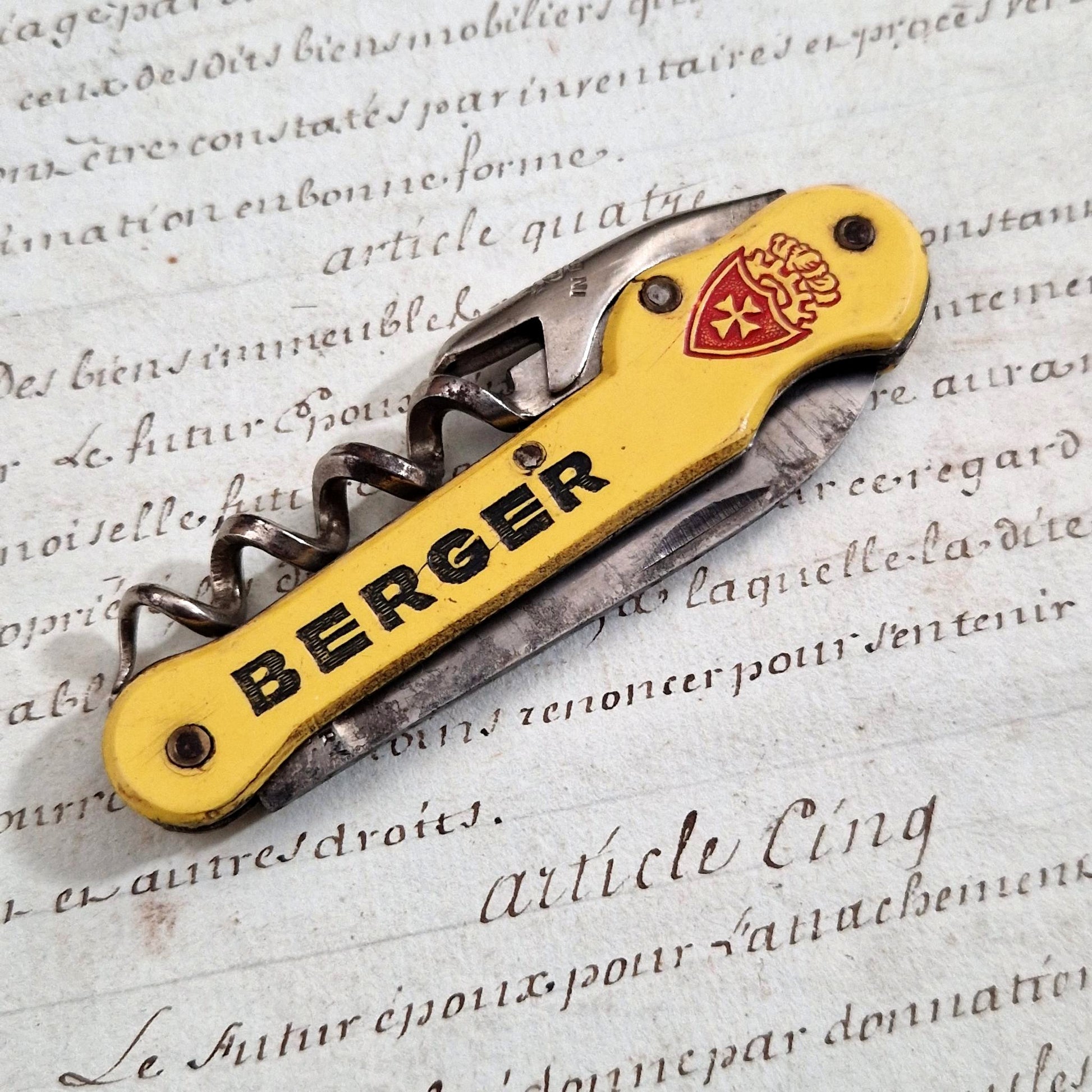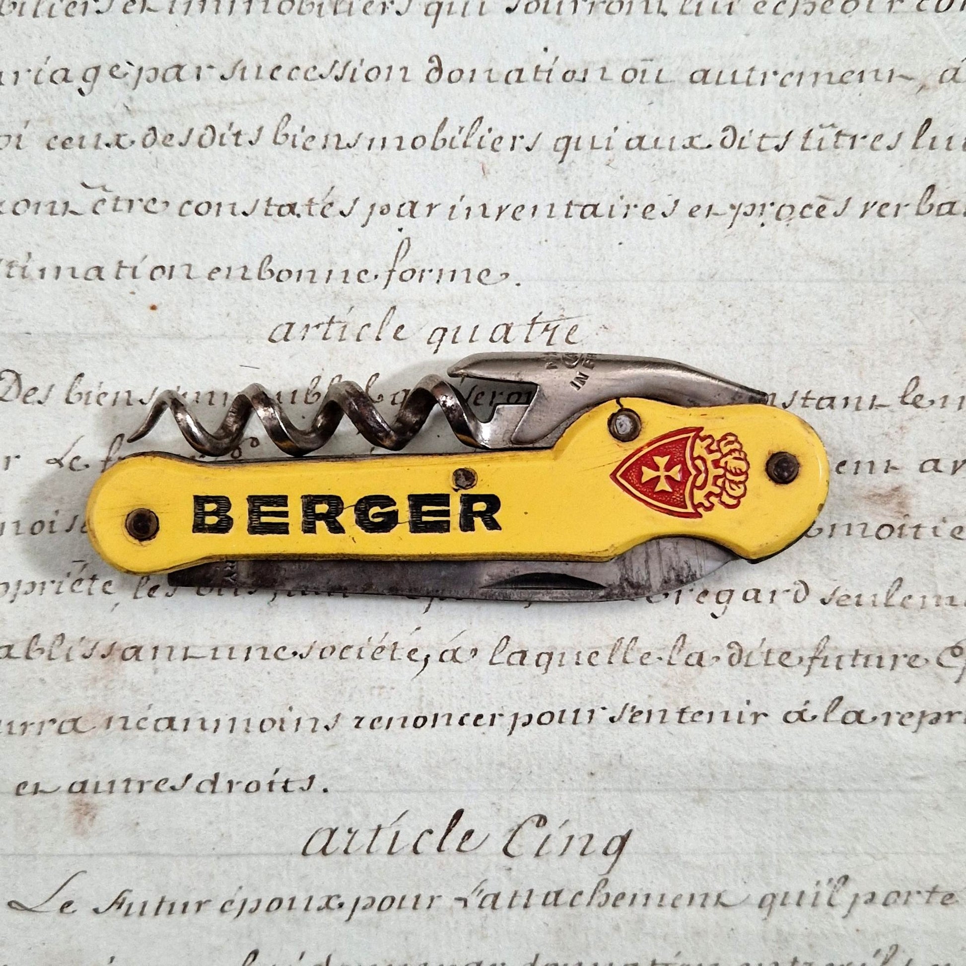 An antique advertising bottle opener in the colors of the Berger company, featuring a riveted yellow synthetic handle marked "BERGER" in black letters and adorned with a red crest bearing a cross. This multi-functional model includes a steel corkscrew, a bottle opener, and a folding blade. The piece is stamped, indicating French manufacture. A typical promotional item distributed in cafes and bars in the mid-20th century.