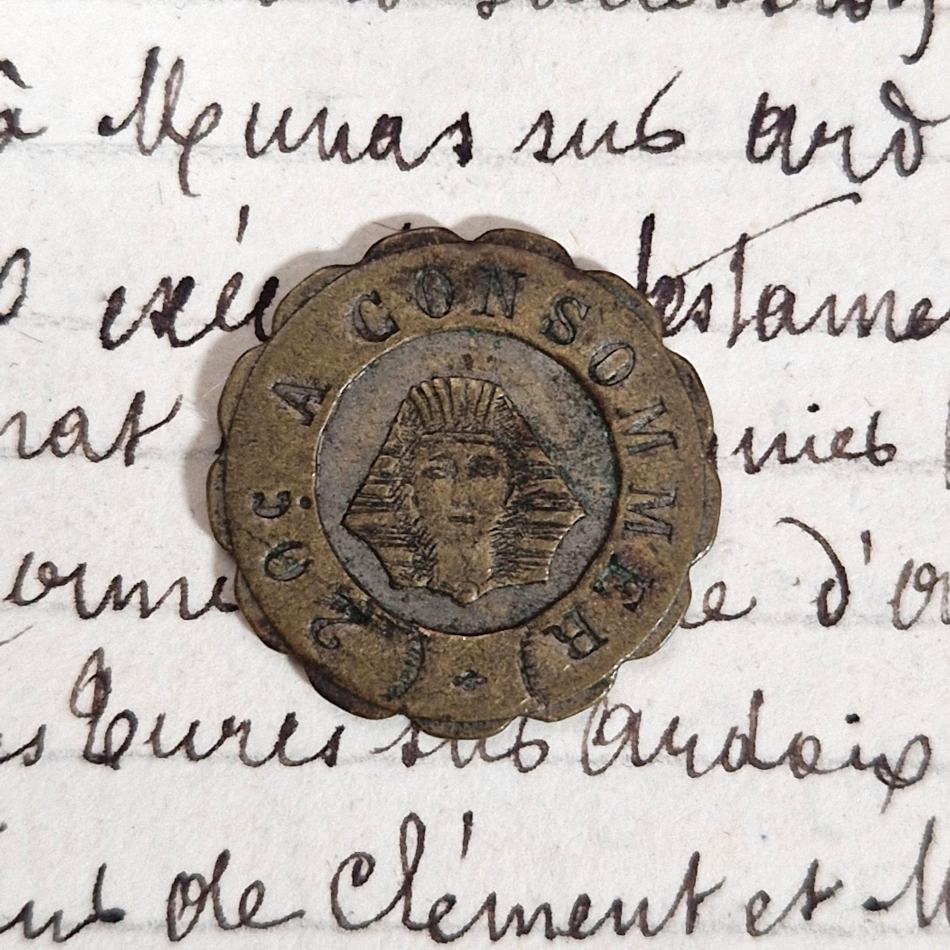 Petit jeton de consommation en laiton, au décor particulièrement original représentant un sphinx stylisé dans un médaillon central, entouré de la mention « A CONSOMMER ». Ce type de jeton était utilisé dans les cafés, brasseries ou établissements populaires pour matérialiser une consommation prépayée ou différée. Le motif orientaliste, très en vogue à la fin du XIXe siècle après les campagnes d’Égypte et l’engouement pour l’égyptomanie, en fait un modèle plus recherché que les jetons classiques. Sa forme festonnée renforce son caractère décoratif et typique des productions de comptoir de la Belle Époque.