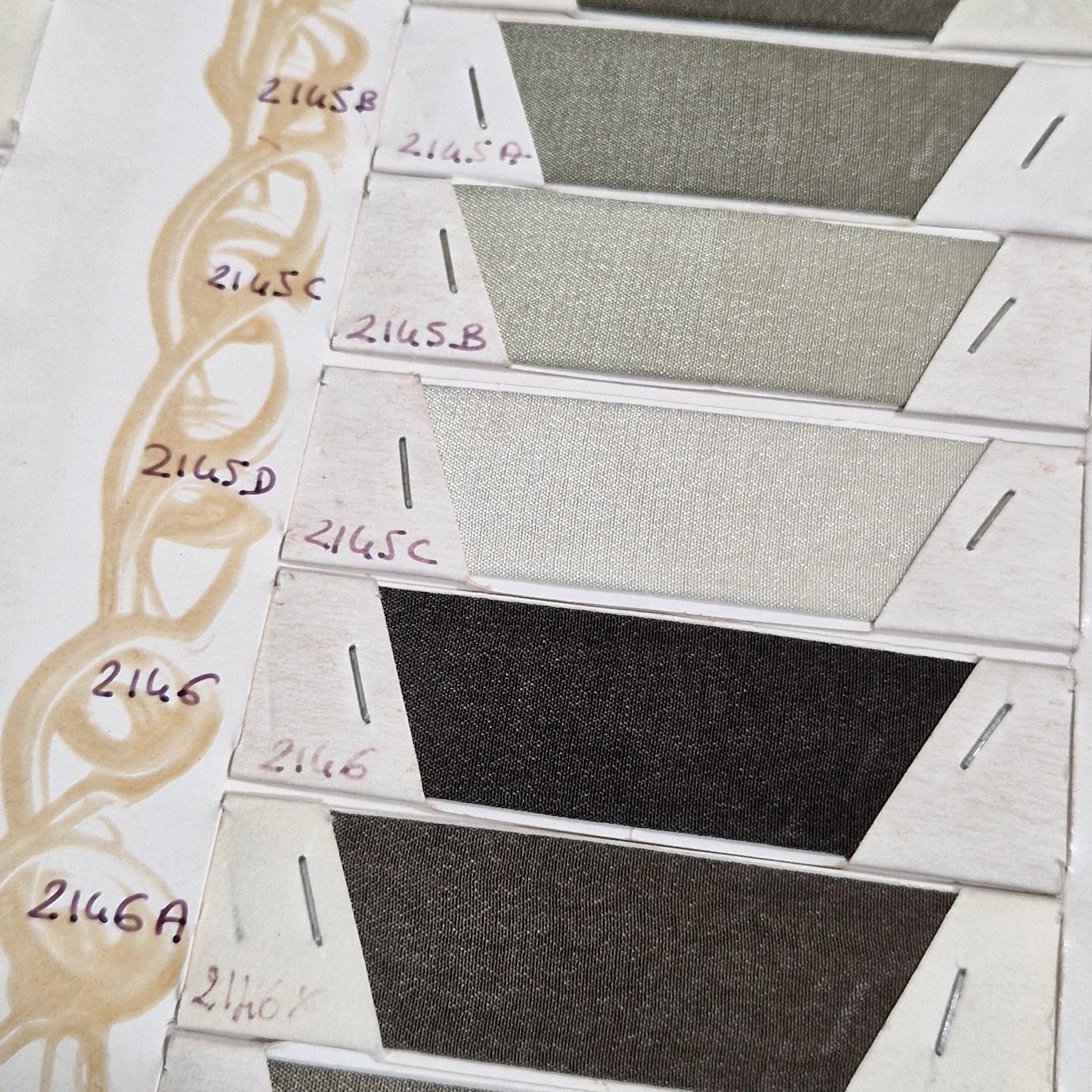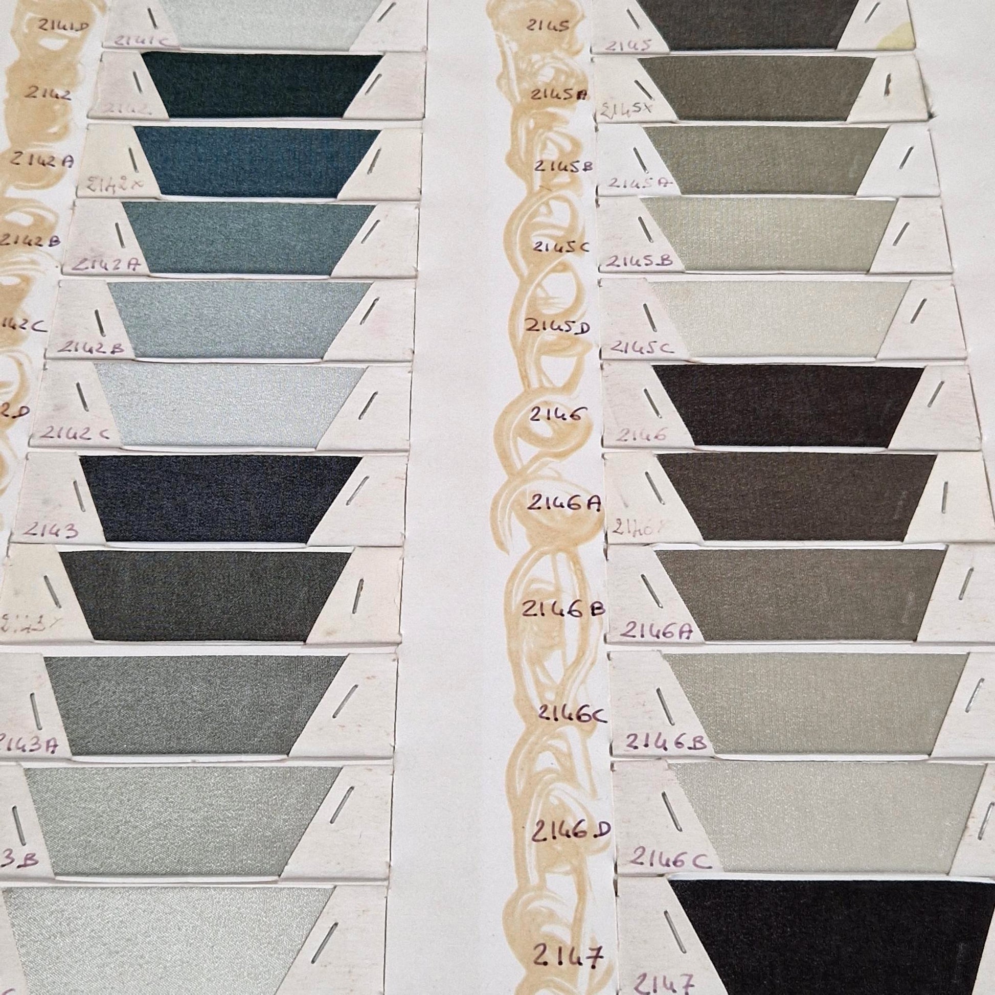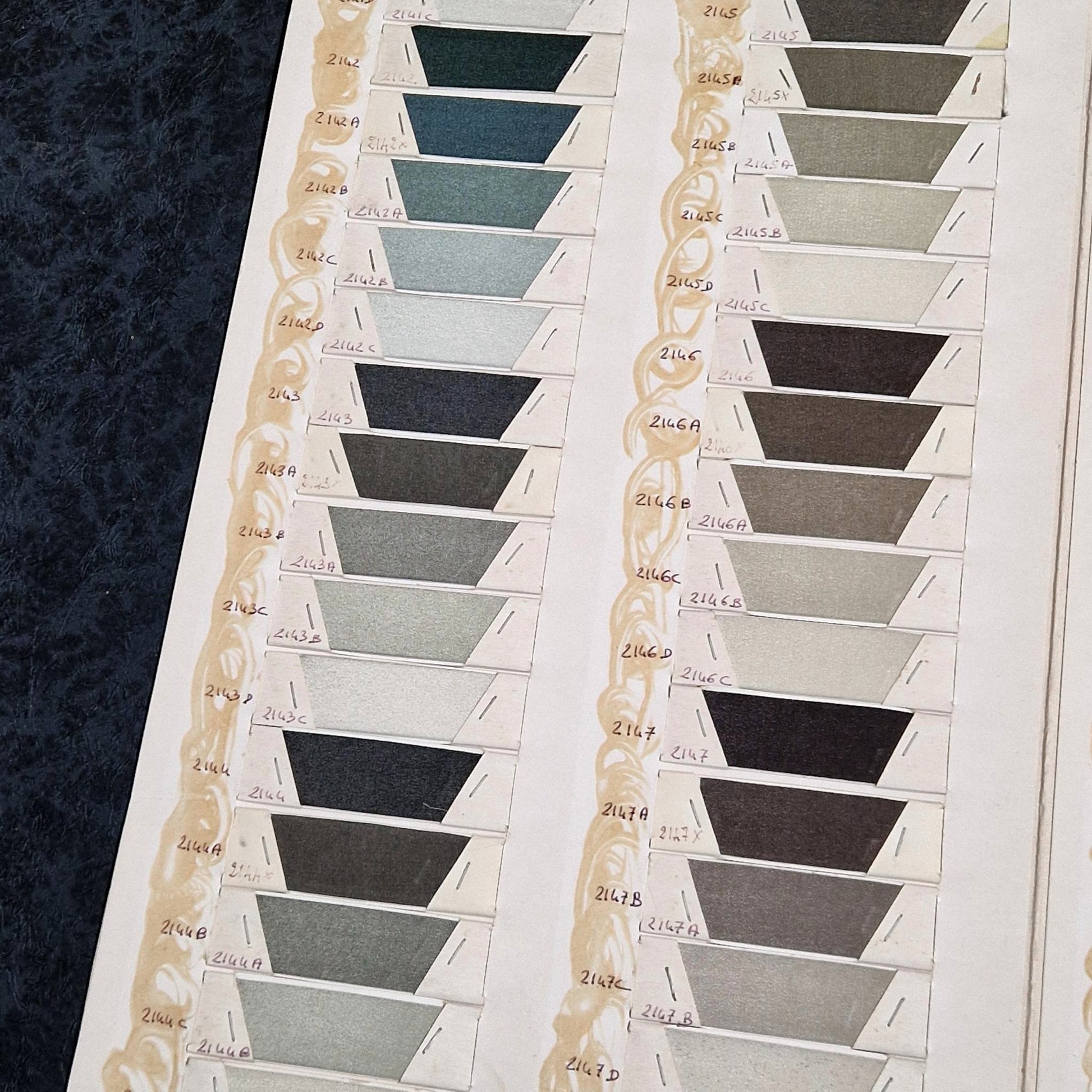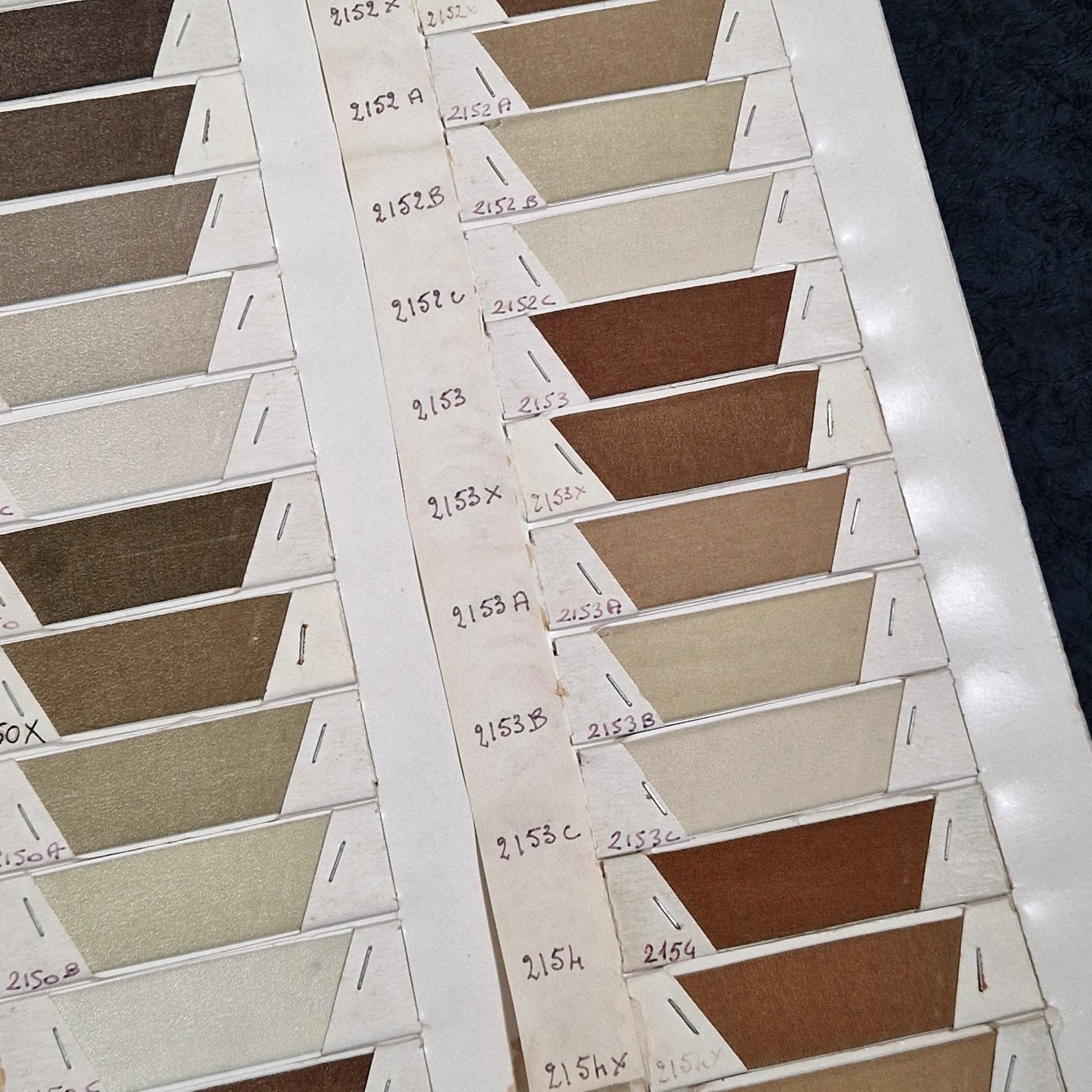 Nuancier professionnel issu d’un atelier textile français, présentant une série organisée d’échantillons dans des tonalités sobres allant du gris au brun, en passant par des nuances kaki et beige. Chaque teinte est référencée à la main, témoignant d’un outil de travail destiné à la mise au point des coloris ou à la présentation de gammes auprès de clients industriels. L’ensemble reflète une esthétique typique des archives de production textile du milieu du XXe siècle, à la fois technique et graphique.