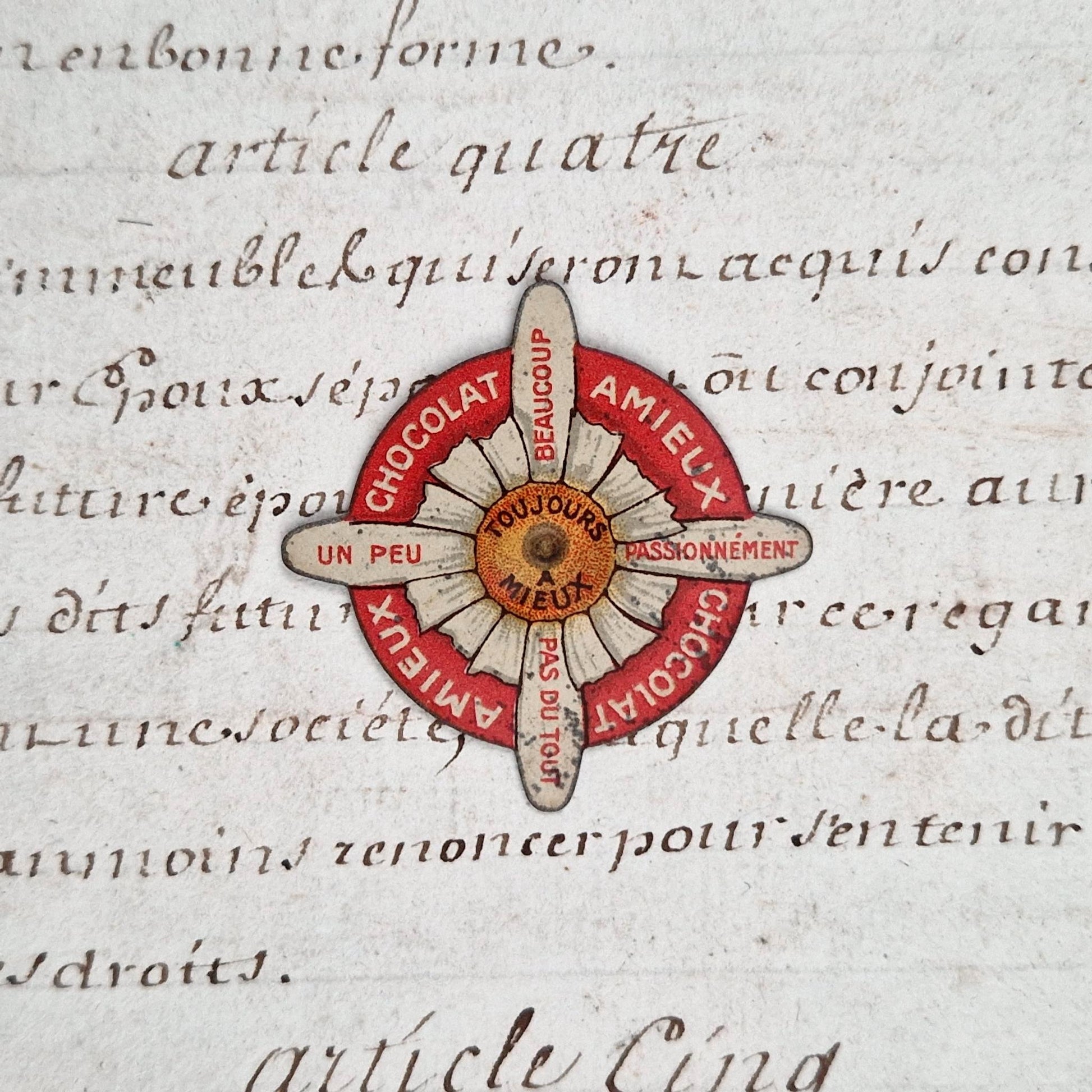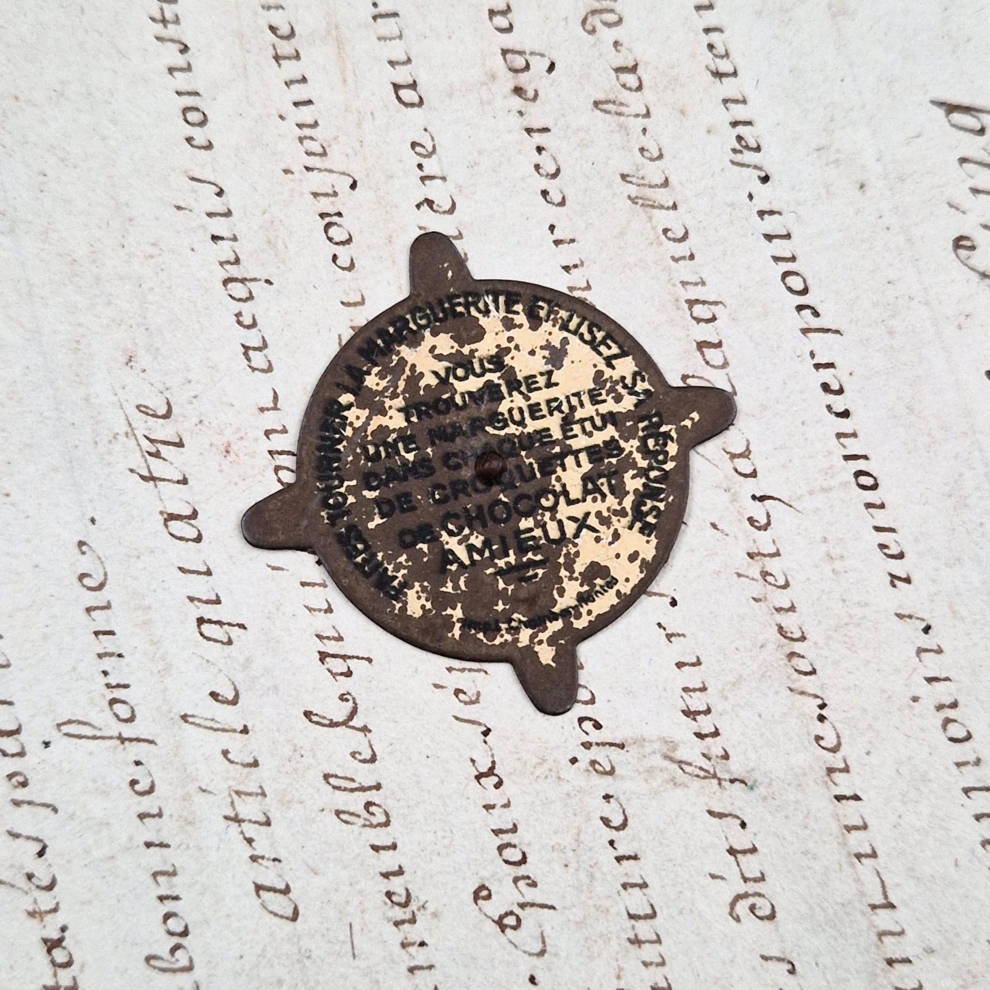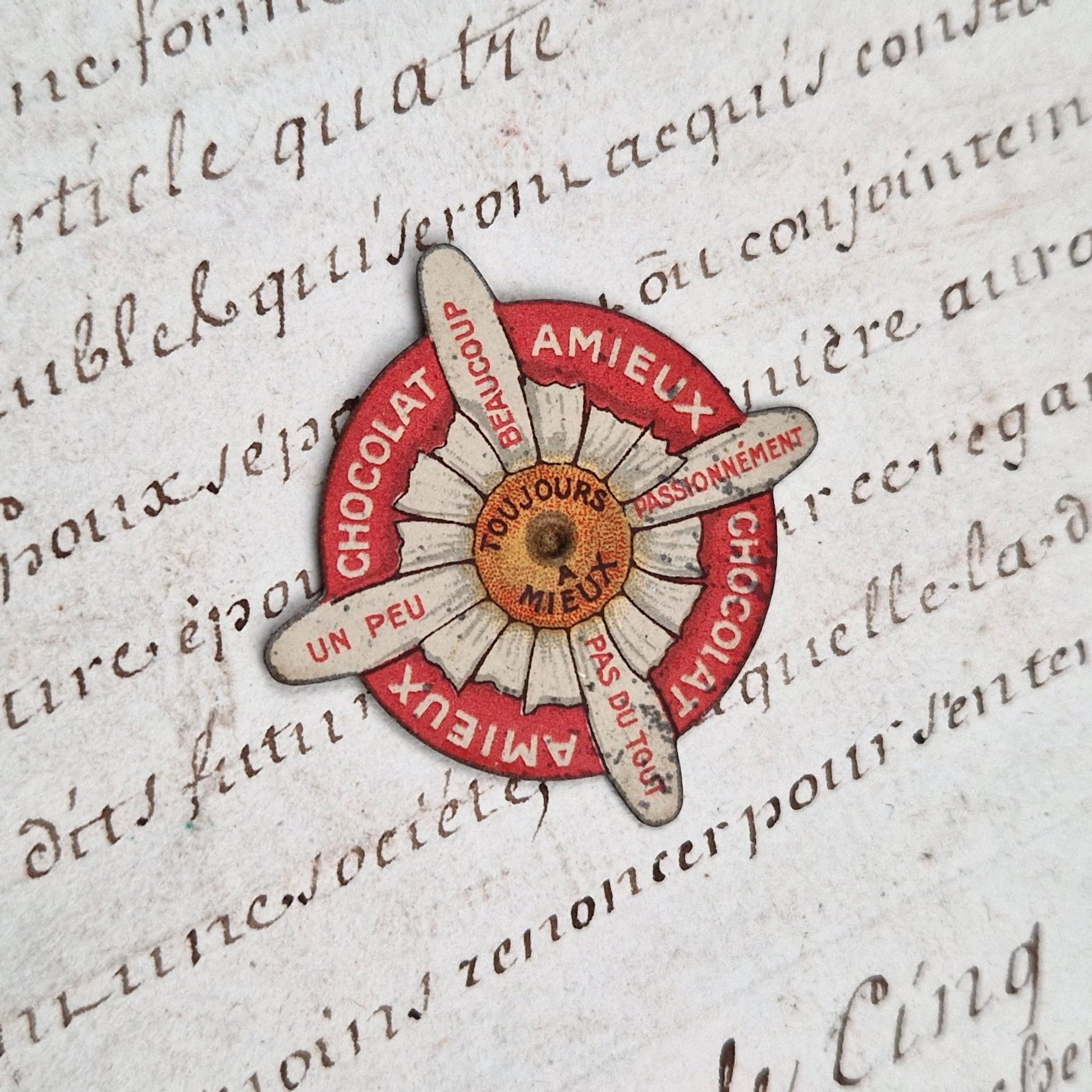 Jolie toupie de comptoir en tôle lithographiée éditée pour la maison Chocolat Amieux, ce charmant objet publicitaire détourne le célèbre jeu de la marguerite « Il m’aime, un peu, beaucoup… » en outil promotionnel ludique. Chaque position de la toupie délivre une réponse sentimentale - un peu, beaucoup, passionnément ou pas du tout - associée à l’univers gourmand du chocolat. Par son graphisme typique du début du XXe siècle et sa fabrication en tôle lithographiée, elle incarne parfaitement ces objets de réclame distribués dans les commerces pour animer la clientèle.