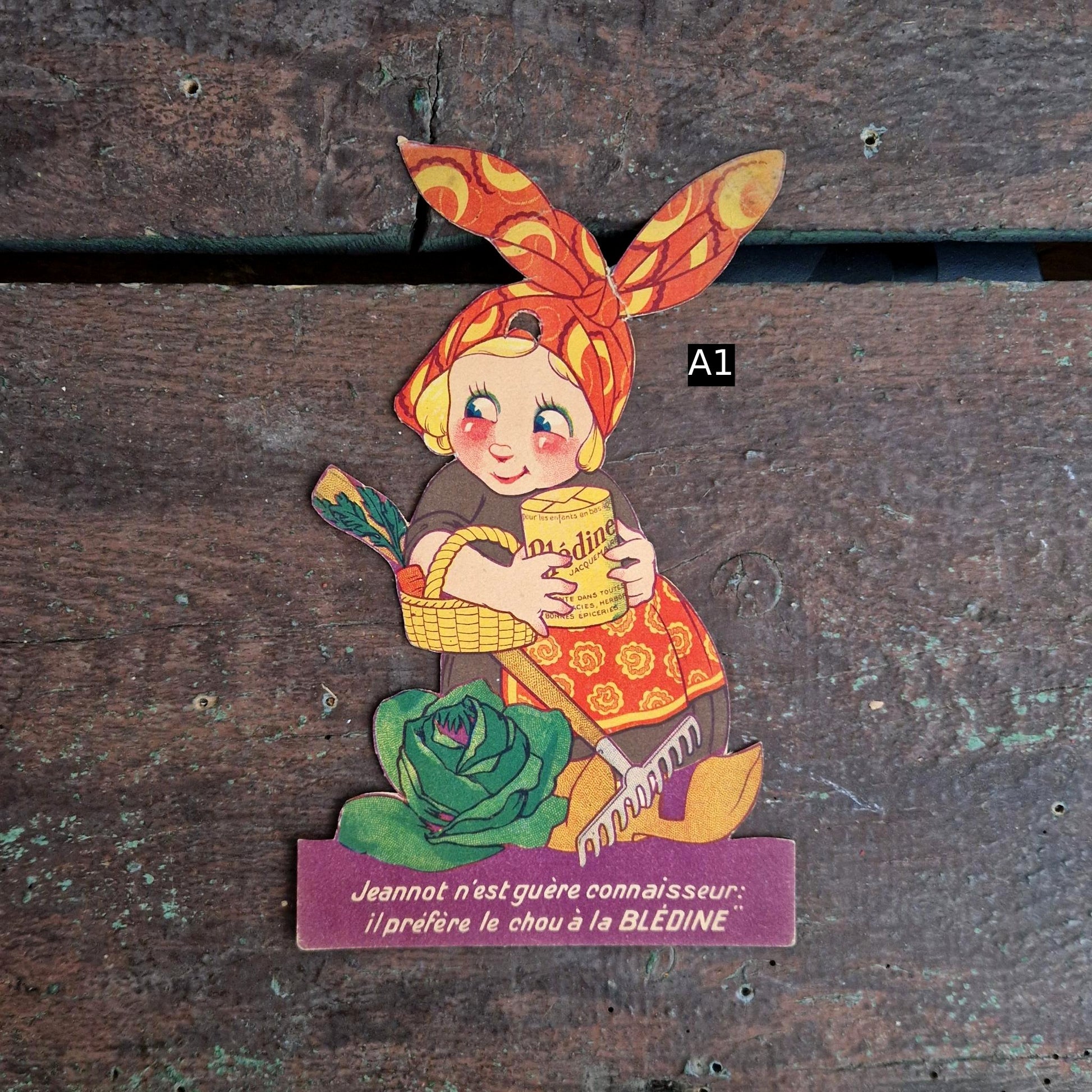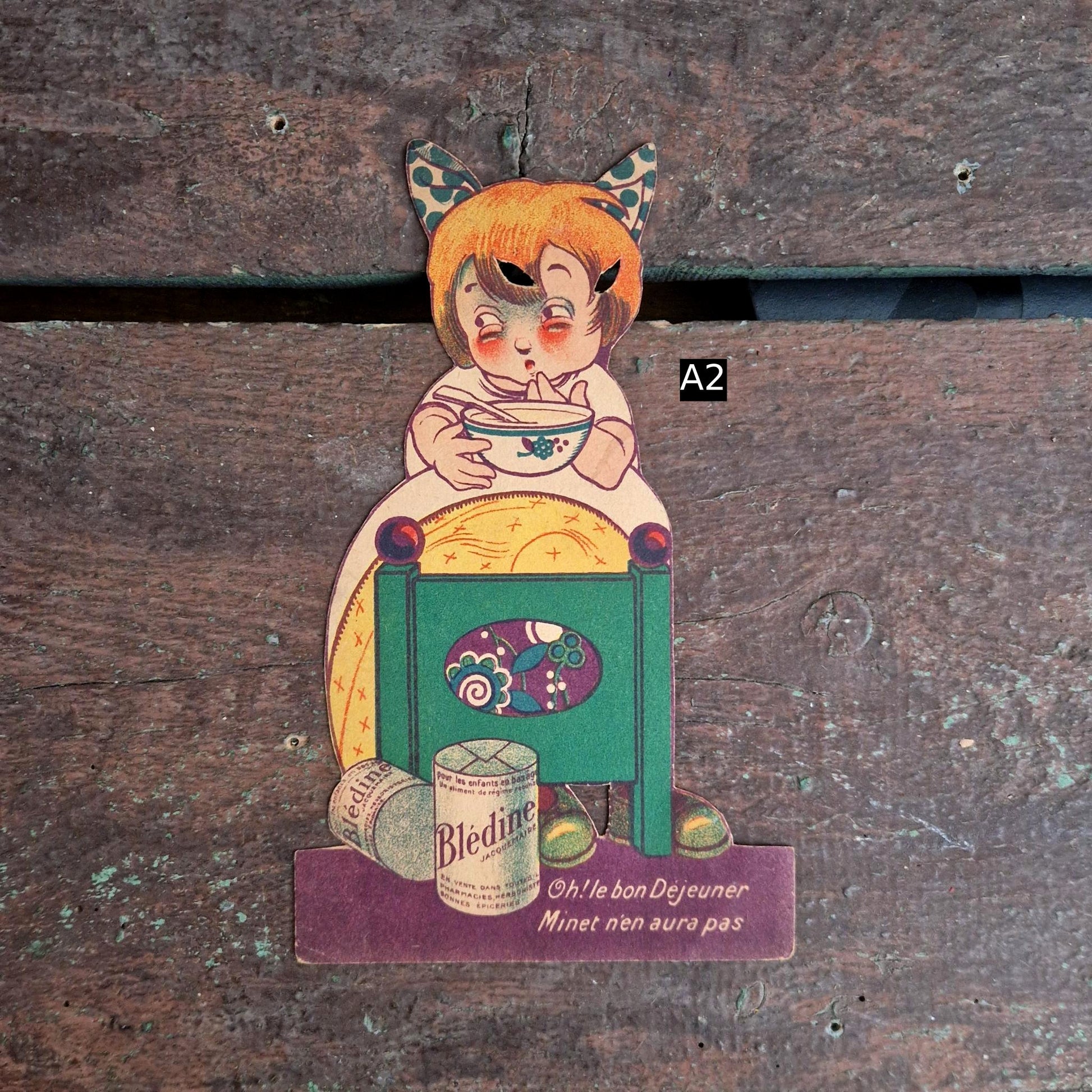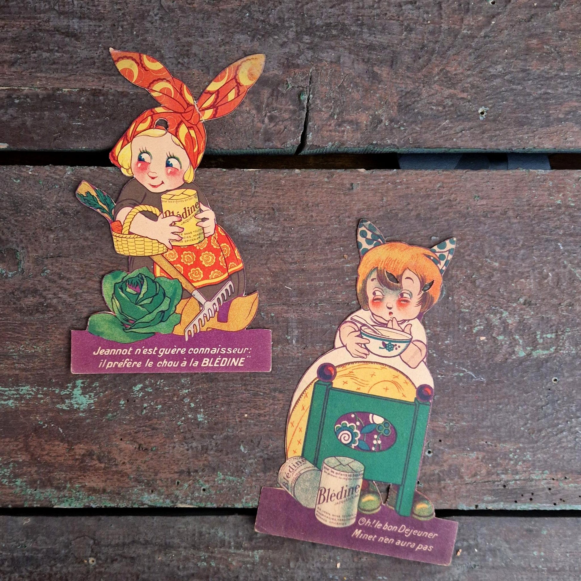 Anciennes petites publicités en carton pour la Blédine (Jacquemaire), au graphisme coloré et typique de l’entre-deux-guerres. Ces découpes mettent en scène des enfants dans des situations du quotidien, avec slogans et mise en avant du produit. Particularité intéressante : au verso, les silhouettes découpées révèlent des formes d’animaux, ici un lapin et un chat, ajoutant une dimension ludique et éducative à ces supports publicitaires destinés aux familles. Des objets à la fois graphiques, narratifs et pleins de charme. Vendues à l'unité.