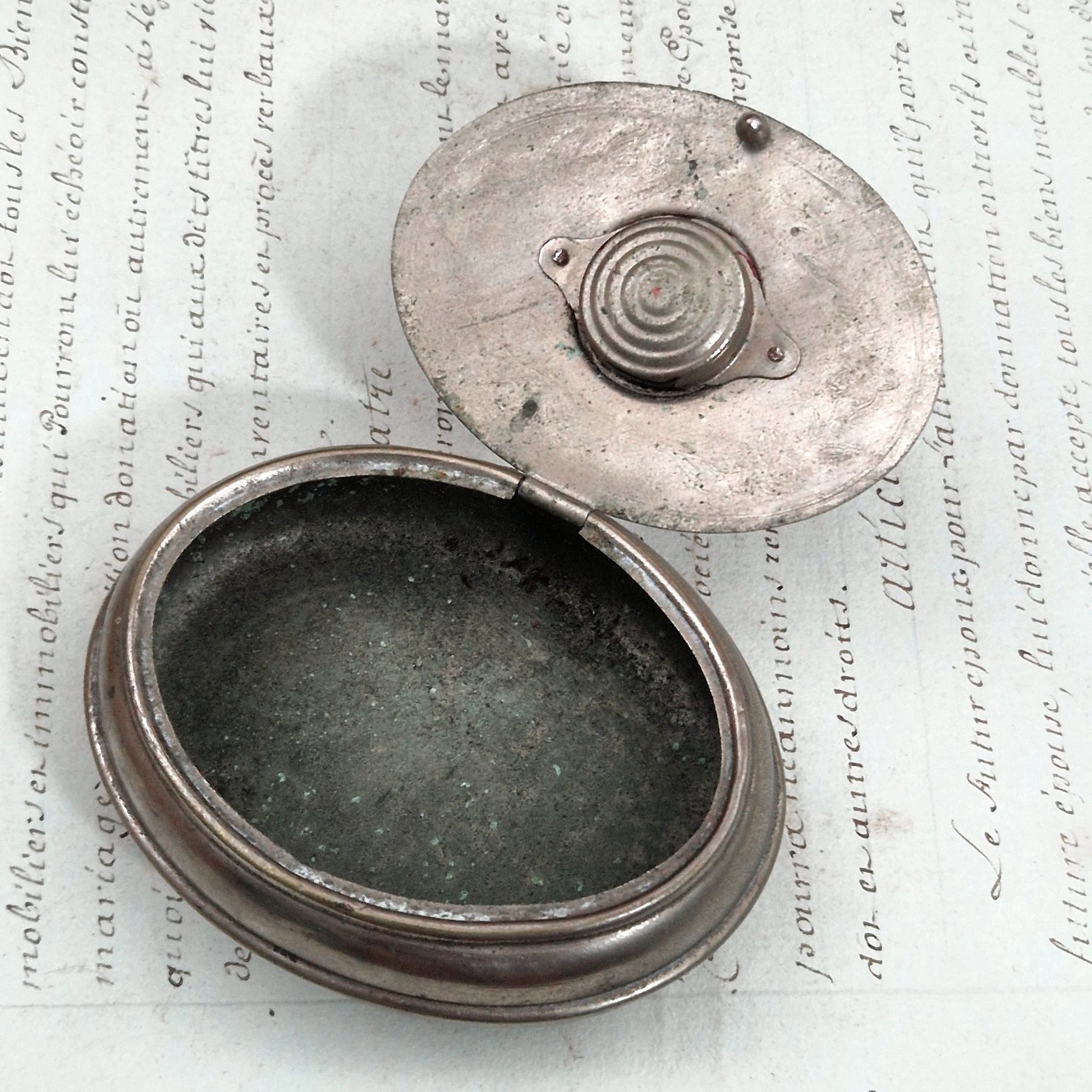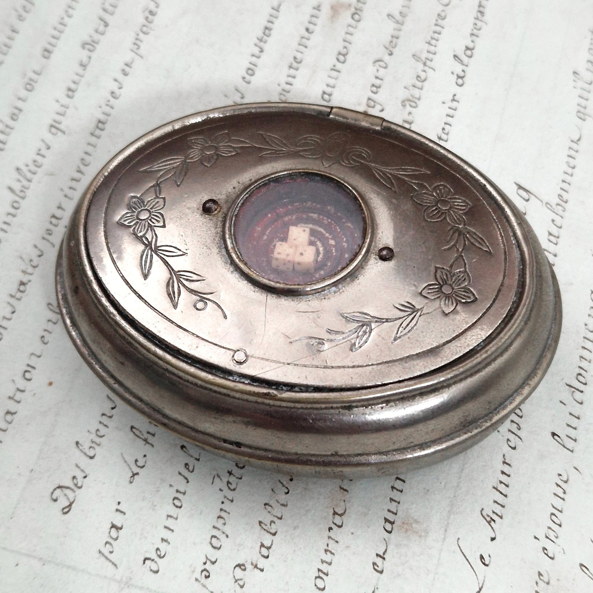 Curieux objet de comptoir à la fois ludique et décoratif, cette petite boîte en métal argenté renferme dans son couvercle un jeu de 3 dés visibles à travers un hublot en verre. Ce type d’objet portatif était utilisé dans les cafés, débits de boissons ou comptoirs pour animer des jeux rapides entre amis, souvent associés à des mises symboliques. Le décor floral gravé et la conception mécanique simple mais ingénieuse témoignent d’une fabrication du tout début XXe, typique des petits jeux de hasard portatifs.