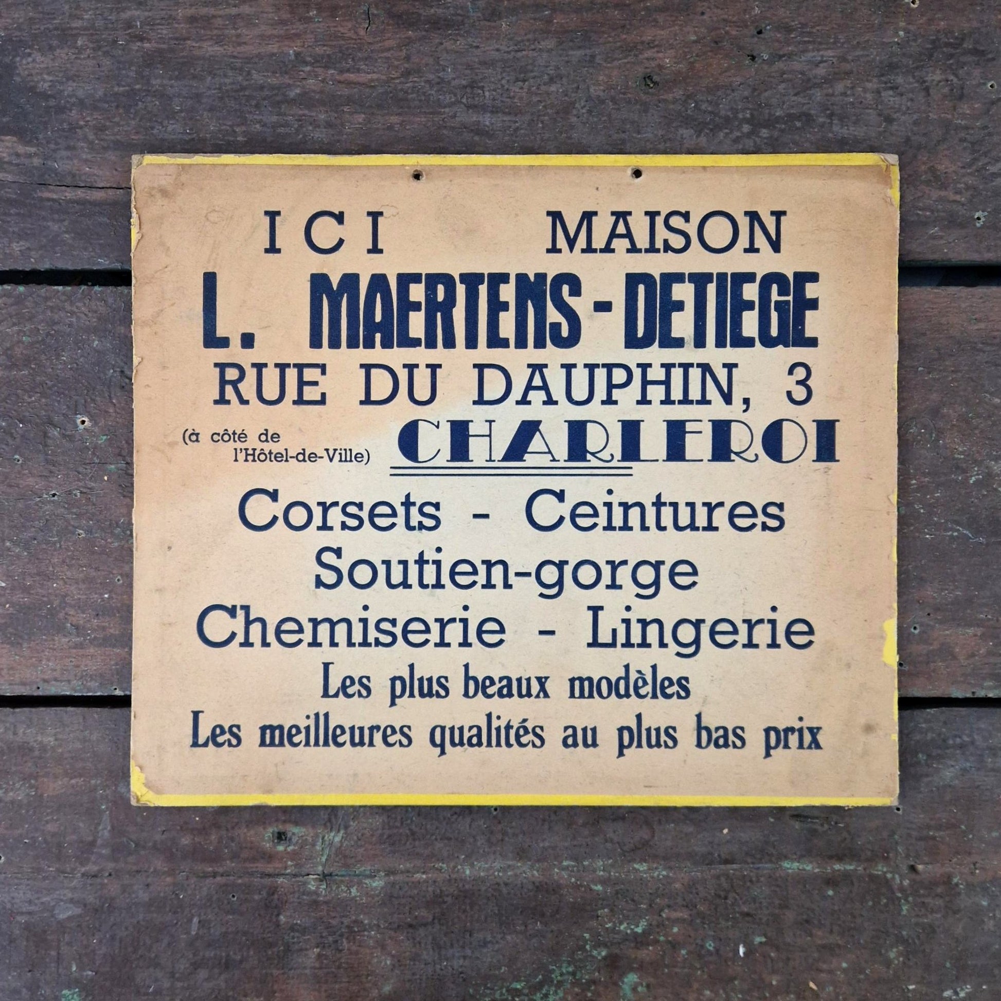 Ancien carton publicitaire double face, imprimé sur carton fort, présentant la maison L. Maertens-Detiege située rue du Dauphin à Charleroi. La typographie élégante et structurée met en avant une offre complète autour de la lingerie féminine - corsets, ceintures, soutien-gorge et chemiserie - dans un esprit typique des commerces de la Belle Époque. L’impression en bleu profond sur fond crème, associée à une bordure jaune d’origine, confère à l’ensemble une forte présence visuelle. Particularité intéressante : la plaque est imprimée en double face, avec le même visuel des deux côtés, ce qui suggère un usage suspendu en vitrine ou en intérieur de boutique.