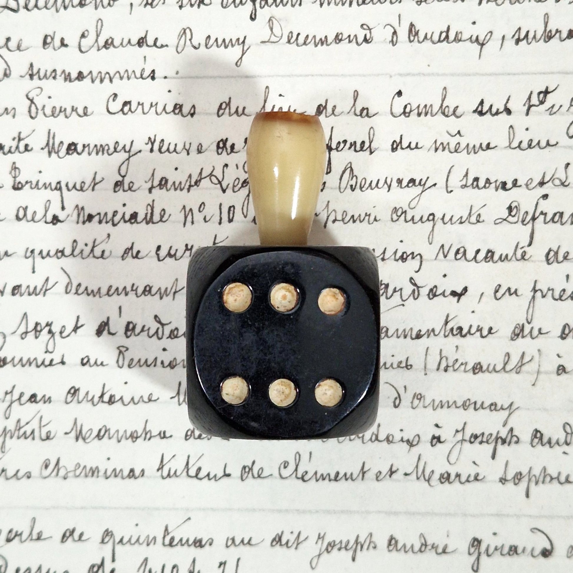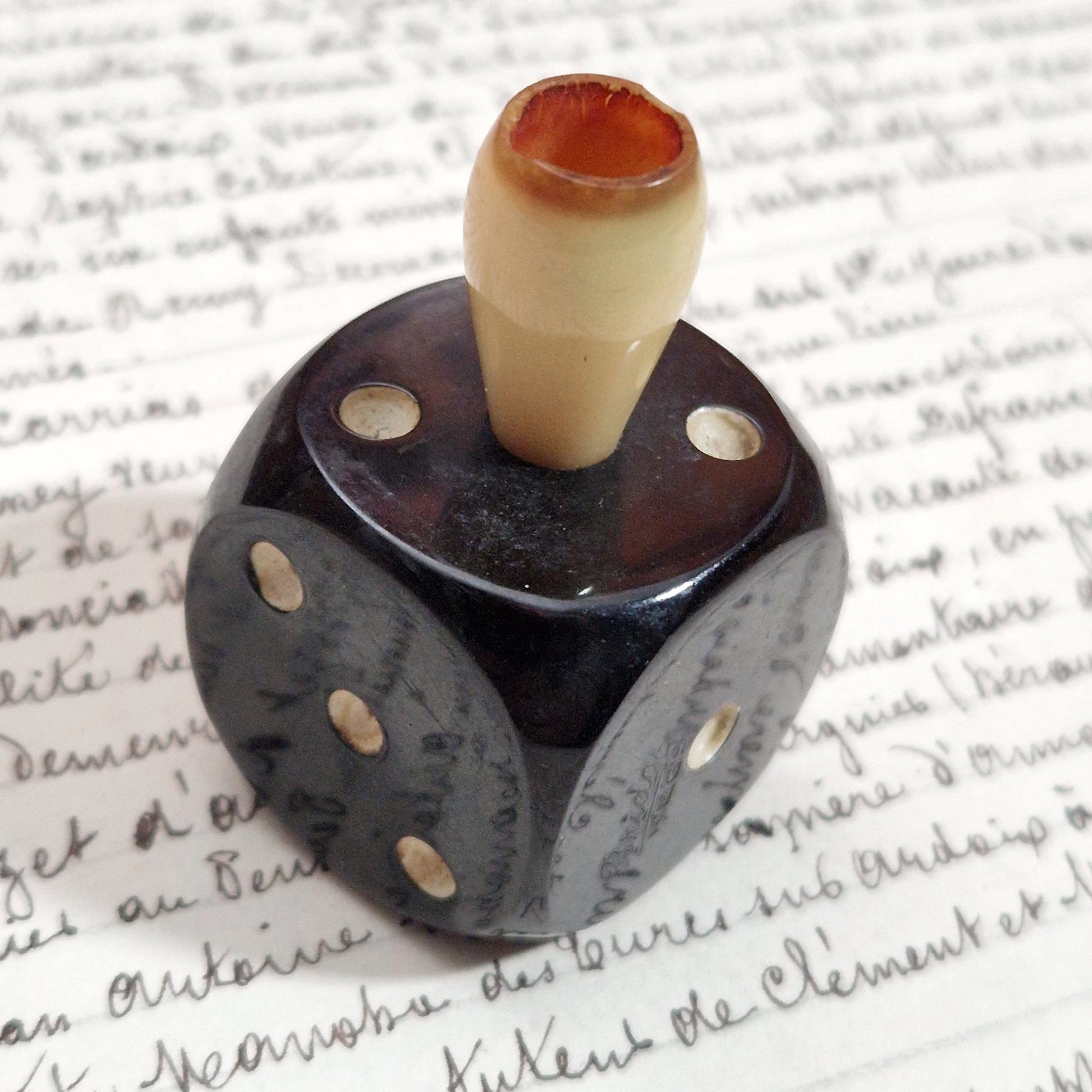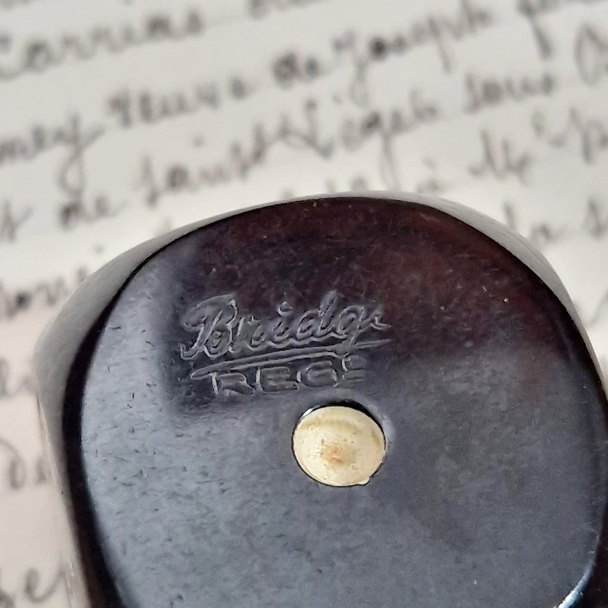 Petit objet aussi discret que fascinant, ce dé mécanique en bakélite noire témoigne des jeux de hasard pratiqués sur les comptoirs au début du XXe siècle. Conçu pour être actionné à l’aide d’une tige vissable, il permettait de faire tourner le dé plutôt que de le lancer, offrant un résultat aléatoire tout en limitant les manipulations. Son design compact, ses pastilles incrustées et sa patine authentique en font un témoin typique des accessoires de jeu de bistrot, à mi-chemin entre objet ludique et curiosité populaire. Le marquage « Bridger Reg » suggère un modèle déposé, probablement d’origine anglo-saxonne, renforçant son intérêt de collection.