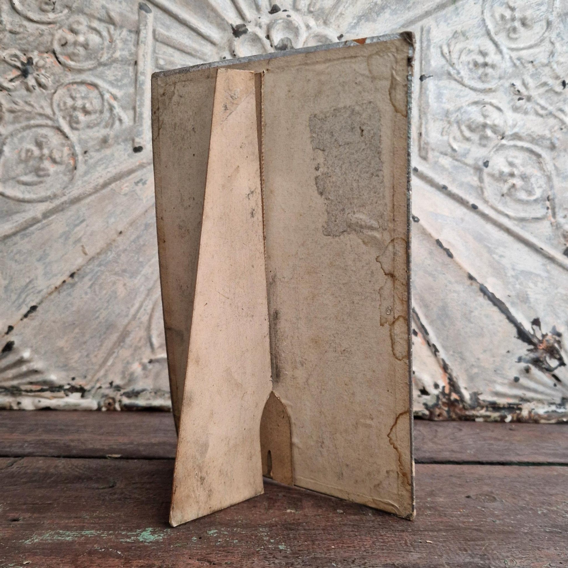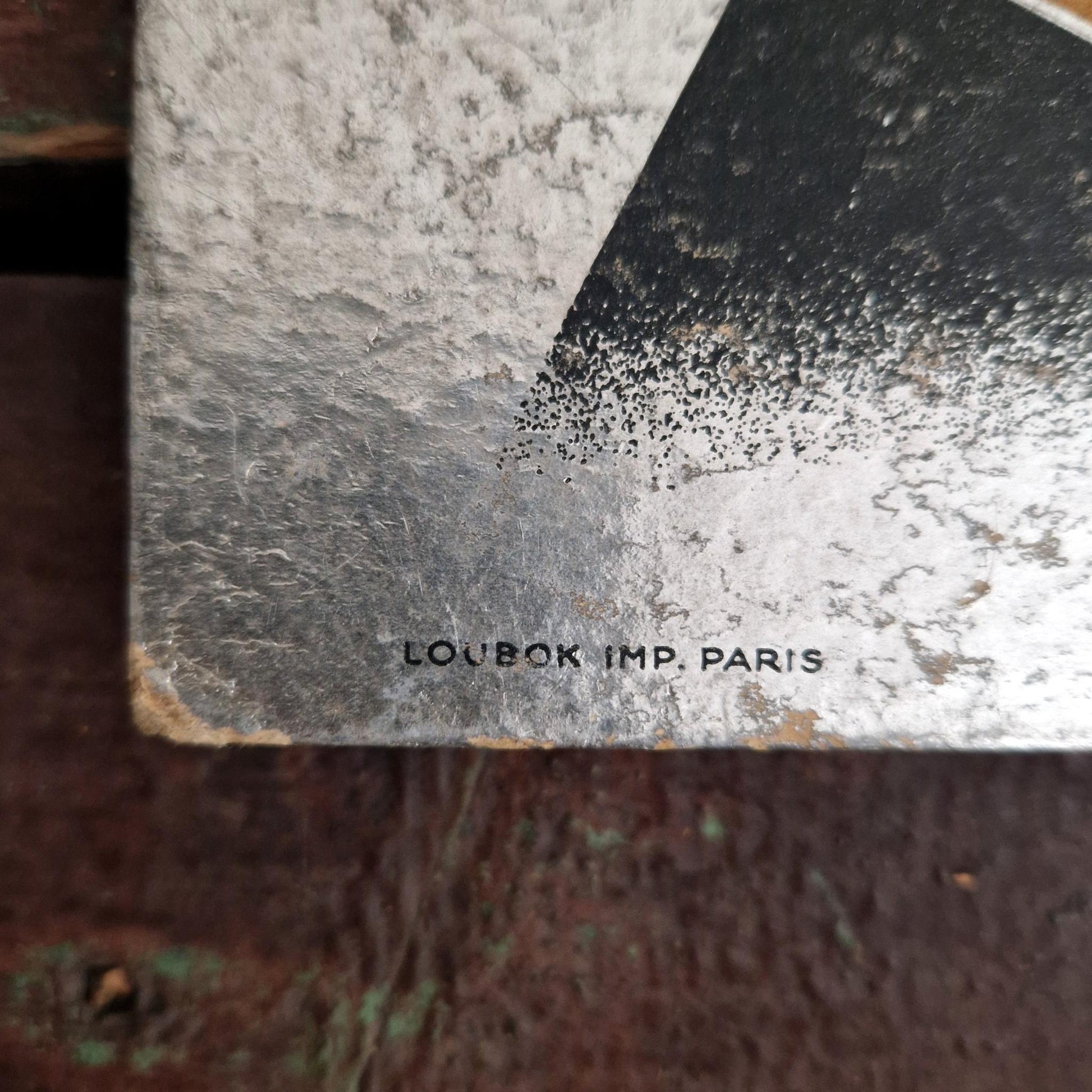 Ancienne publicité cartonnée pour le détacheur « Diabolic » de la marque Lion Noir, au graphisme résolument Art Déco. La composition joue sur les contrastes avec un fond argenté texturé, des diagonales dynamiques et une typographie imposante. Au centre, le flacon stylisé du produit attire immédiatement le regard, renforcé par une mise en page moderne et percutante typique des années 1930. Une pièce publicitaire conçue pour être posée en chevalet, destinée à la présentation en vitrine ou sur comptoir.