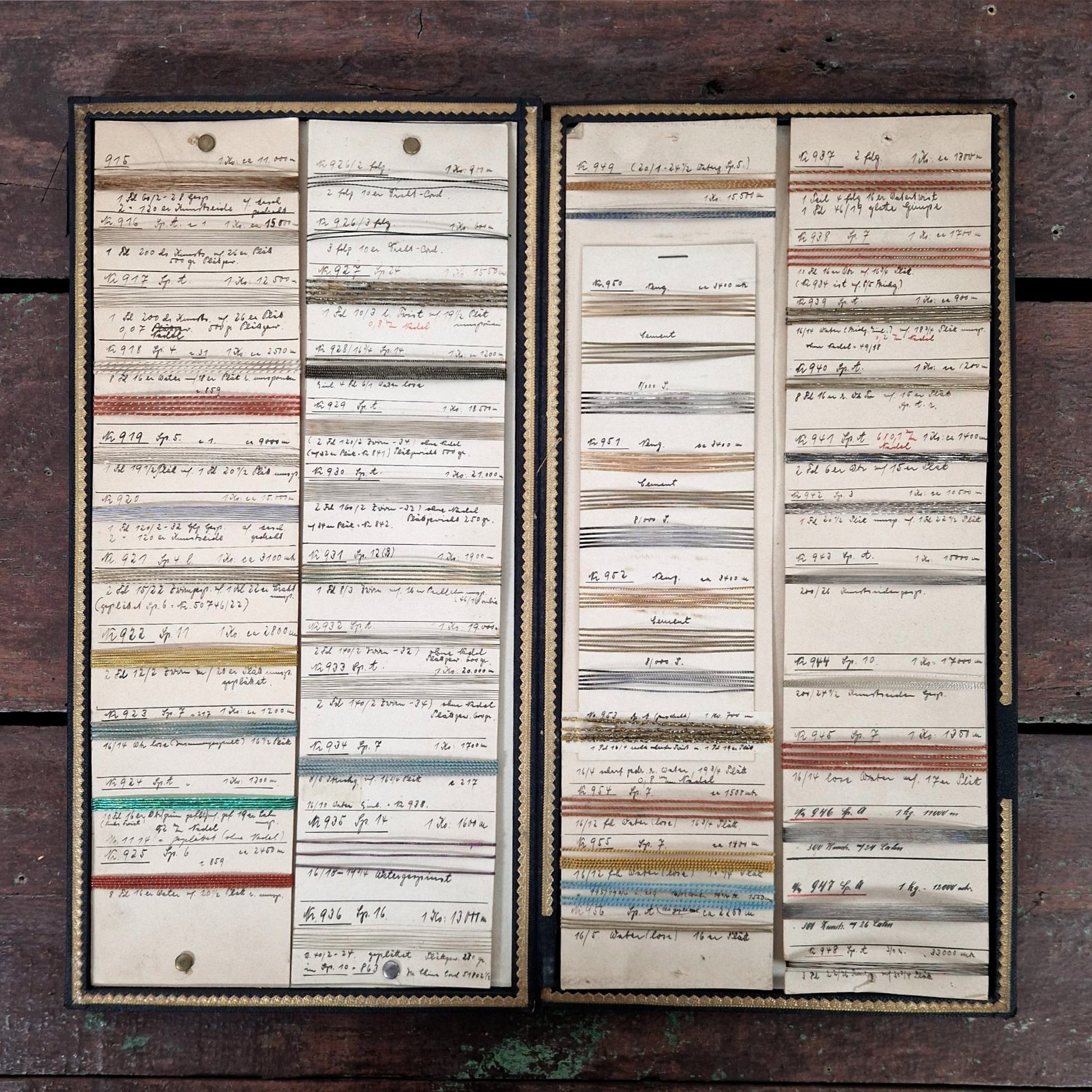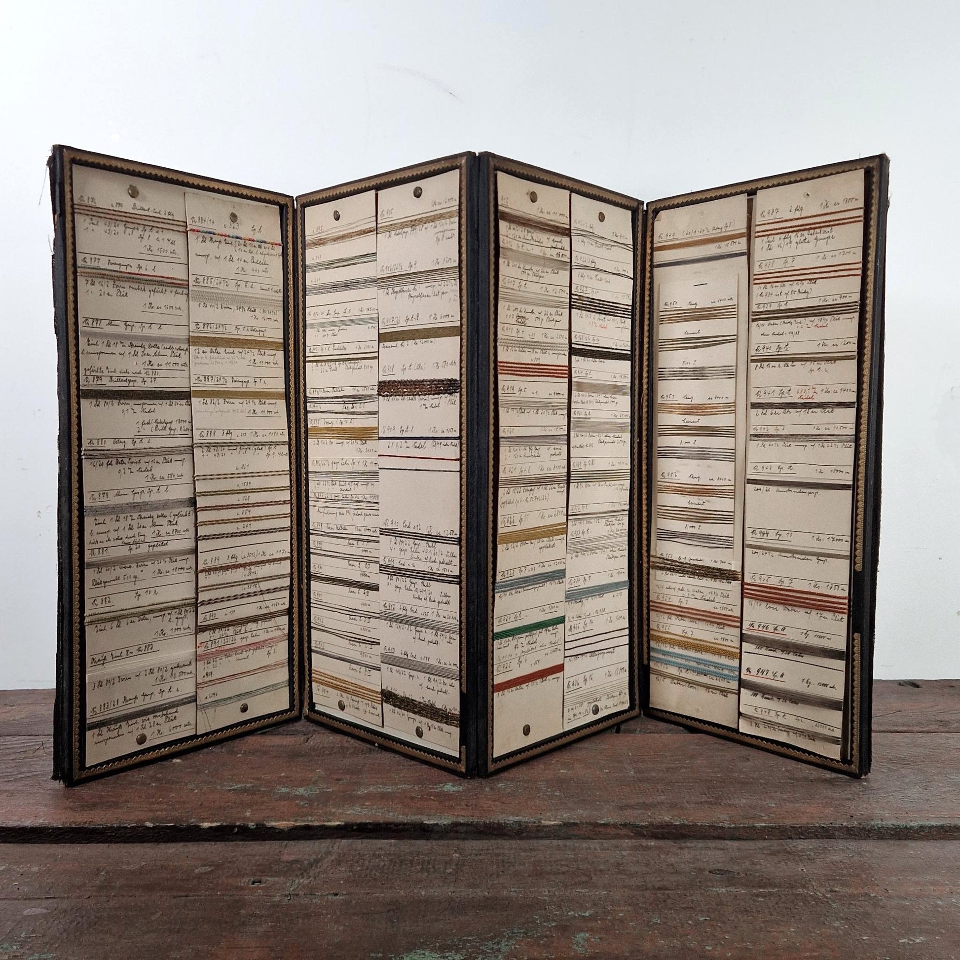Imposant nuancier textile à quatre volets présentant une grande variété de fils métallisés, cordonnets, galons fins et fils de broderie, soigneusement alignés et accompagnés de nombreuses annotations manuscrites techniques (numéros, références, compositions, métrages). Chaque échantillon est fixé sur carton avec une rigueur quasi scientifique, révélant un outil de travail destiné à un fabricant, représentant ou atelier spécialisé dans la passementerie ou la broderie de luxe. La diversité des textures (torsadés, lisses, multicolores, fils métalliques) et la densité des références en font un témoignage exceptionnel des savoir-faire textiles de la fin du XIXe - début XXe siècle.