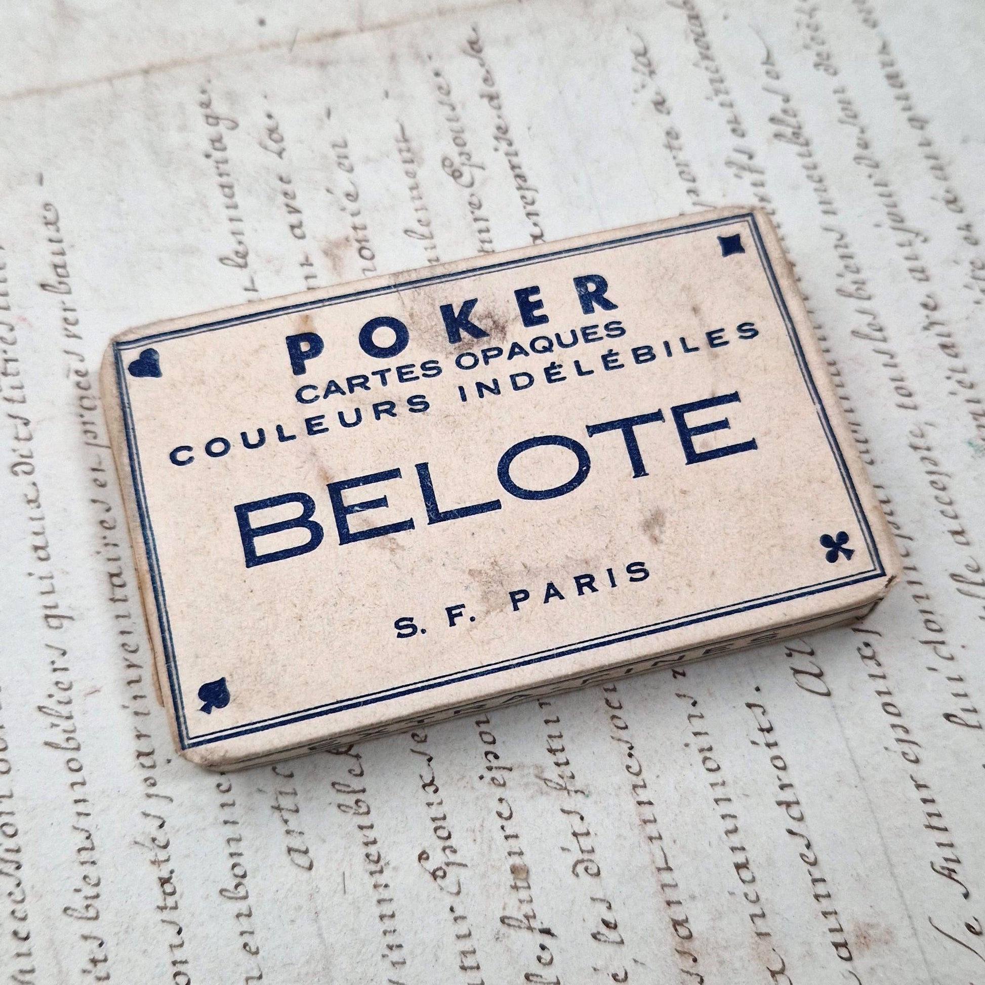 Jeu de cartes complet dans son emballage d’origine, jamais ouvert, imprimé « Poker Belote - Cartes opaques couleurs indélébiles - S.F. Paris », avec mention « Extra-Fines » sur la tranche. Le graphisme typographique bleu sur fond crème, sobre et élégant, est caractéristique des productions françaises de l’entre-deux-guerres.