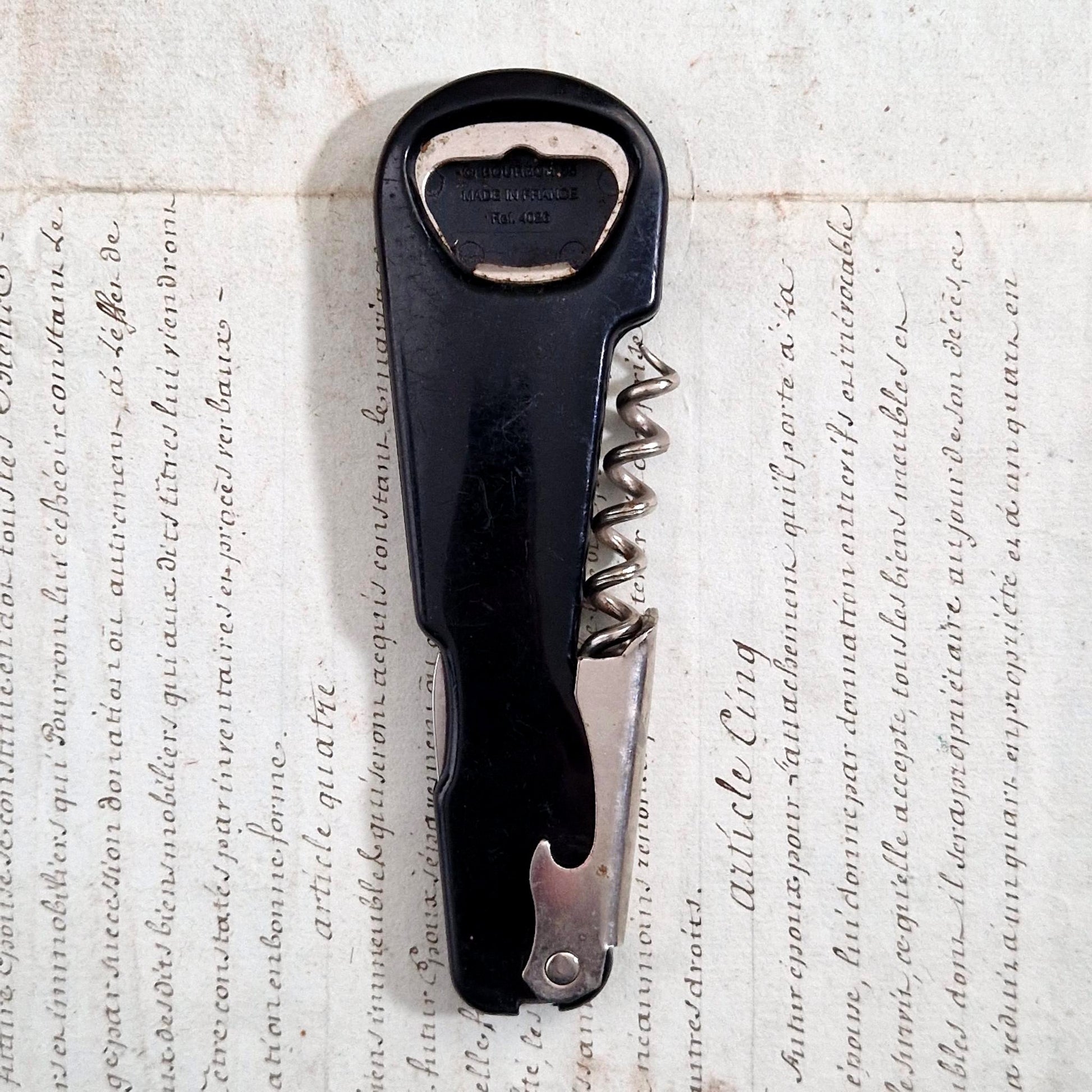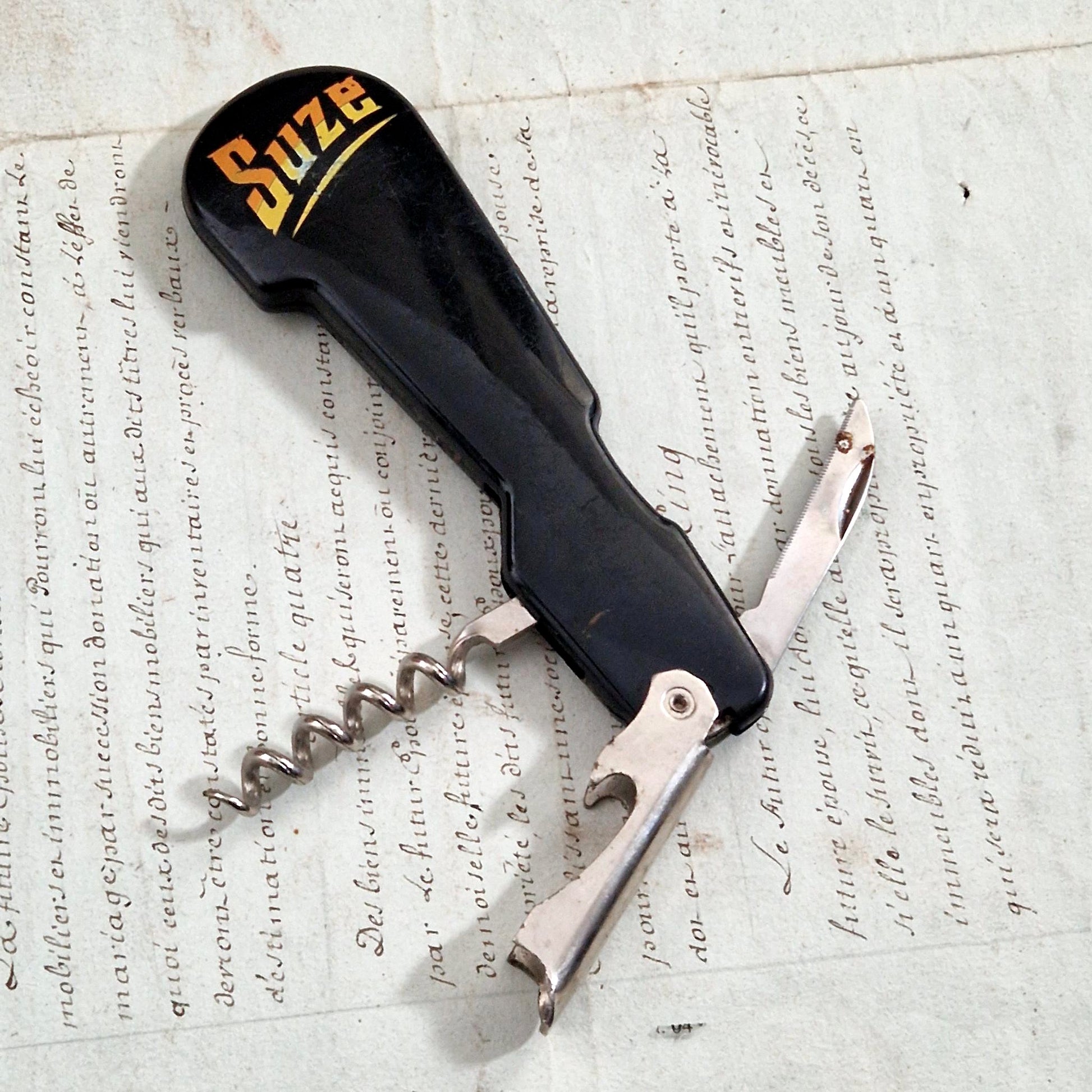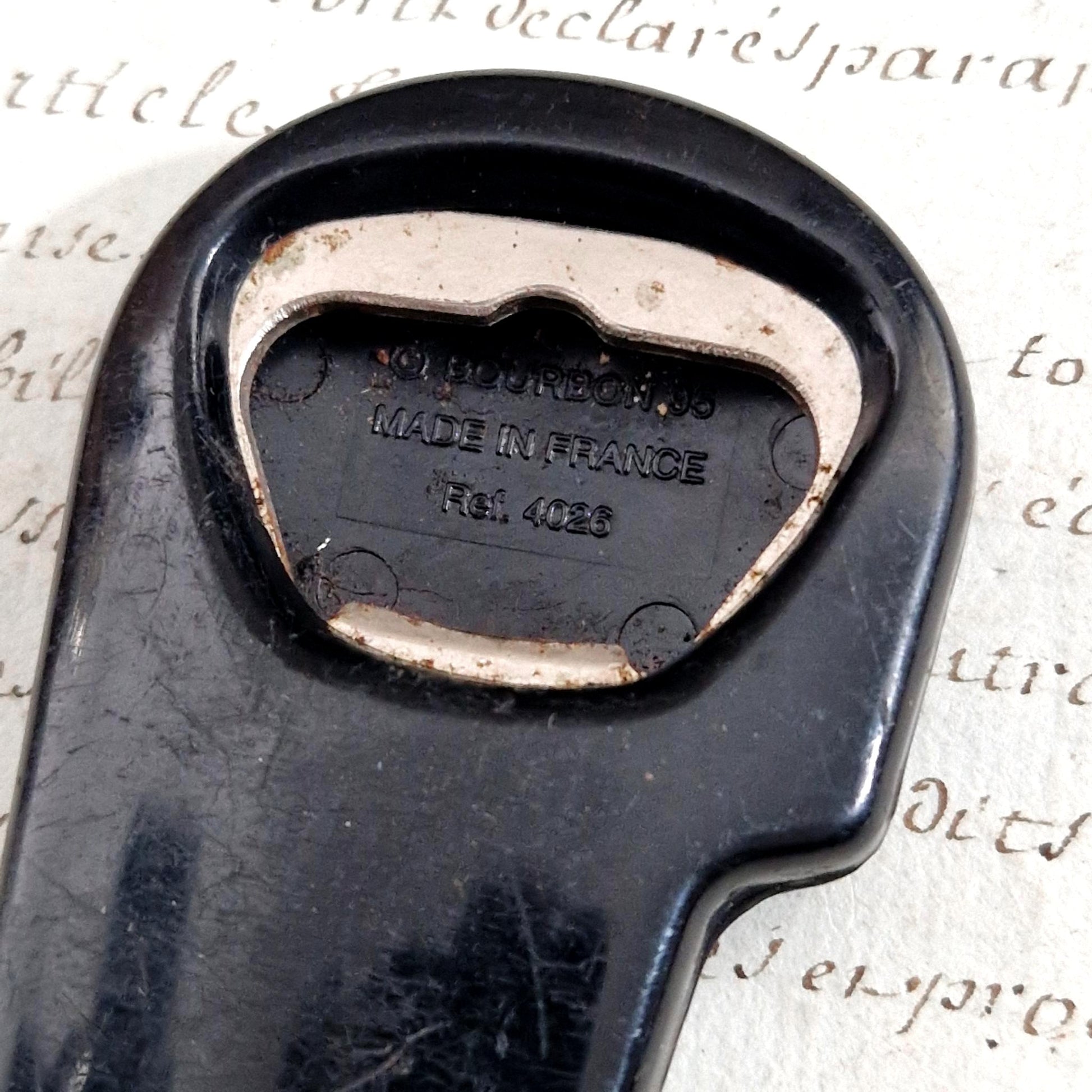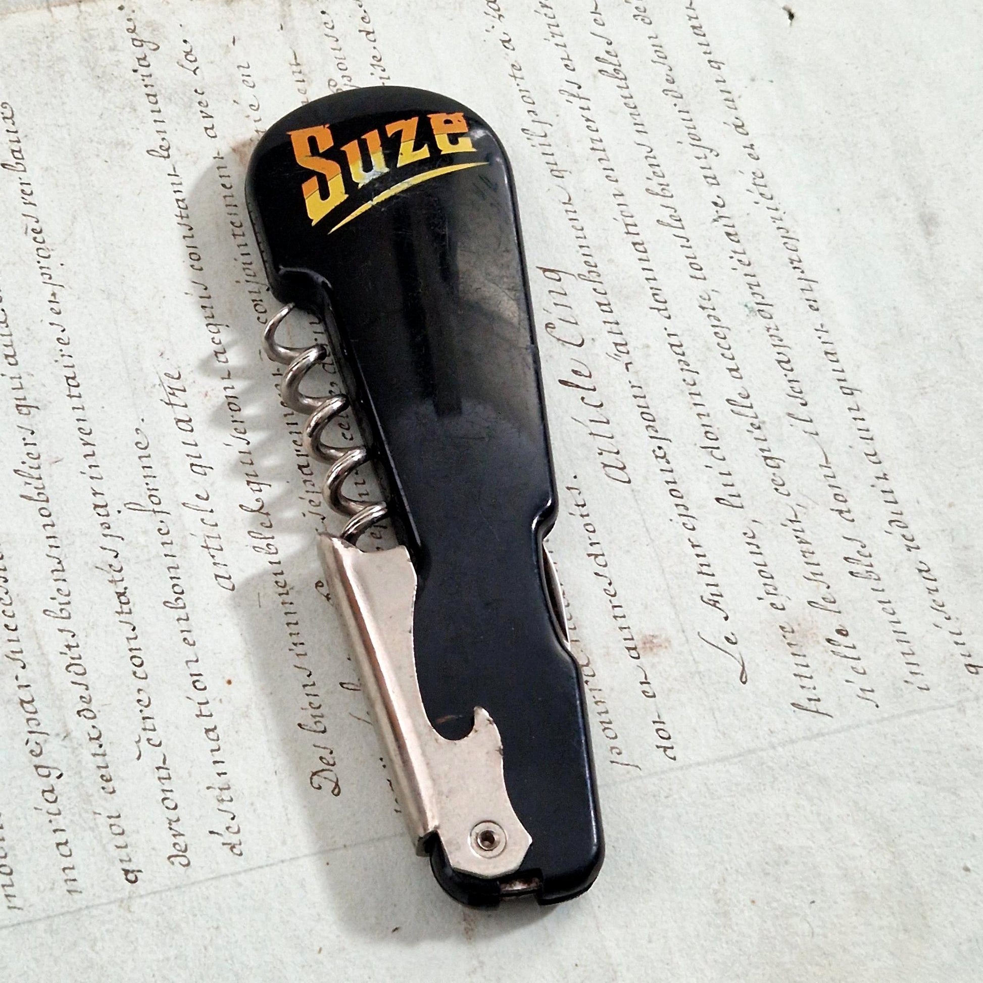 Limonadier pliant publicitaire ancien à l’effigie de la marque Suze, réalisé en matière plastique noire moulée avec marquage jaune et orange caractéristique du graphisme d’après-guerre. Ce modèle de café intègre une mèche de tire-bouchon en acier, un décapsuleur rabattable ainsi qu’une petite lame, répondant aux usages des débits de boissons. Le revers porte le marquage moulé « C. Bourbon 95 - Made in France - Réf. 4026 », identifiant une production française destinée à la publicité de comptoir et aux professionnels du bar dans les années 1950-1960.