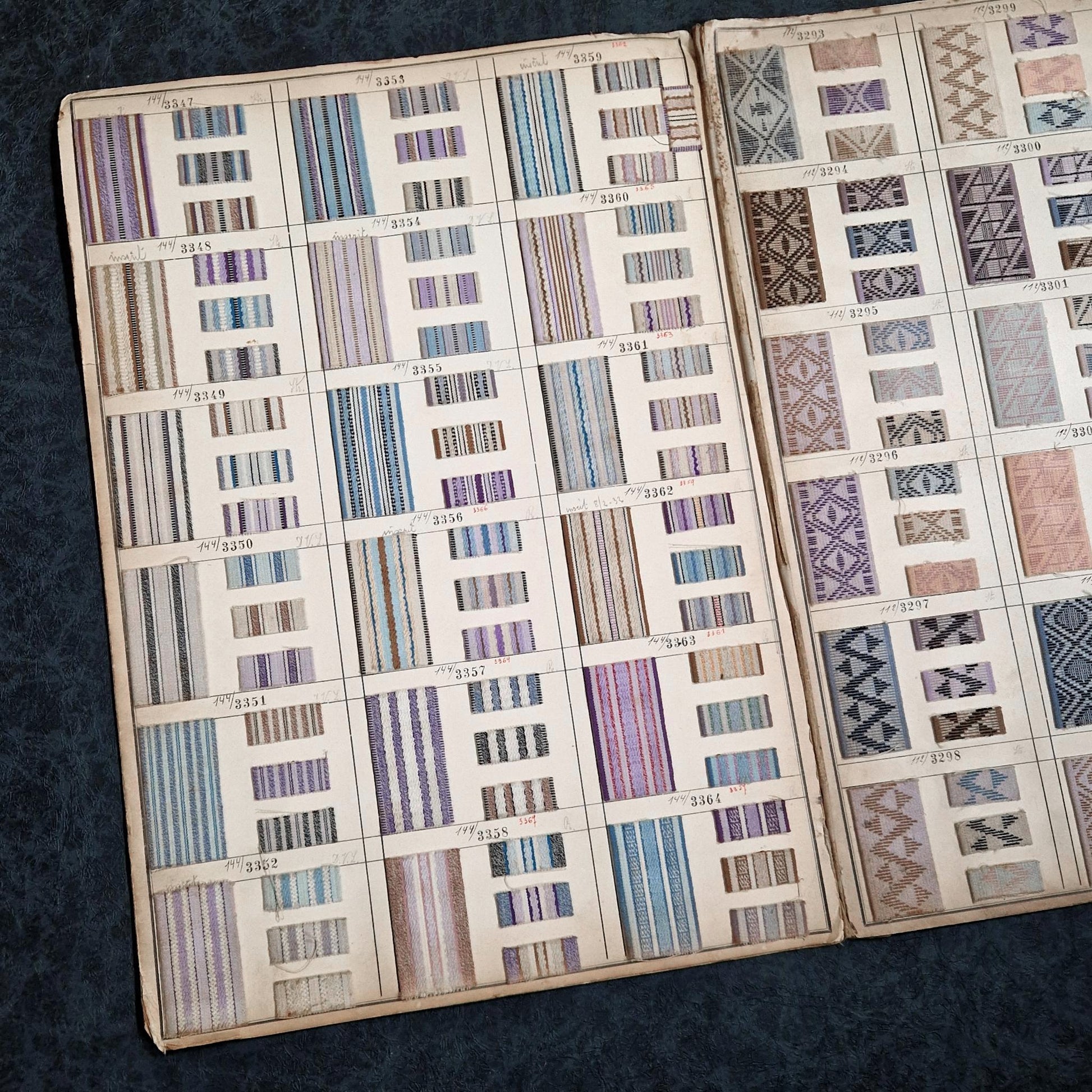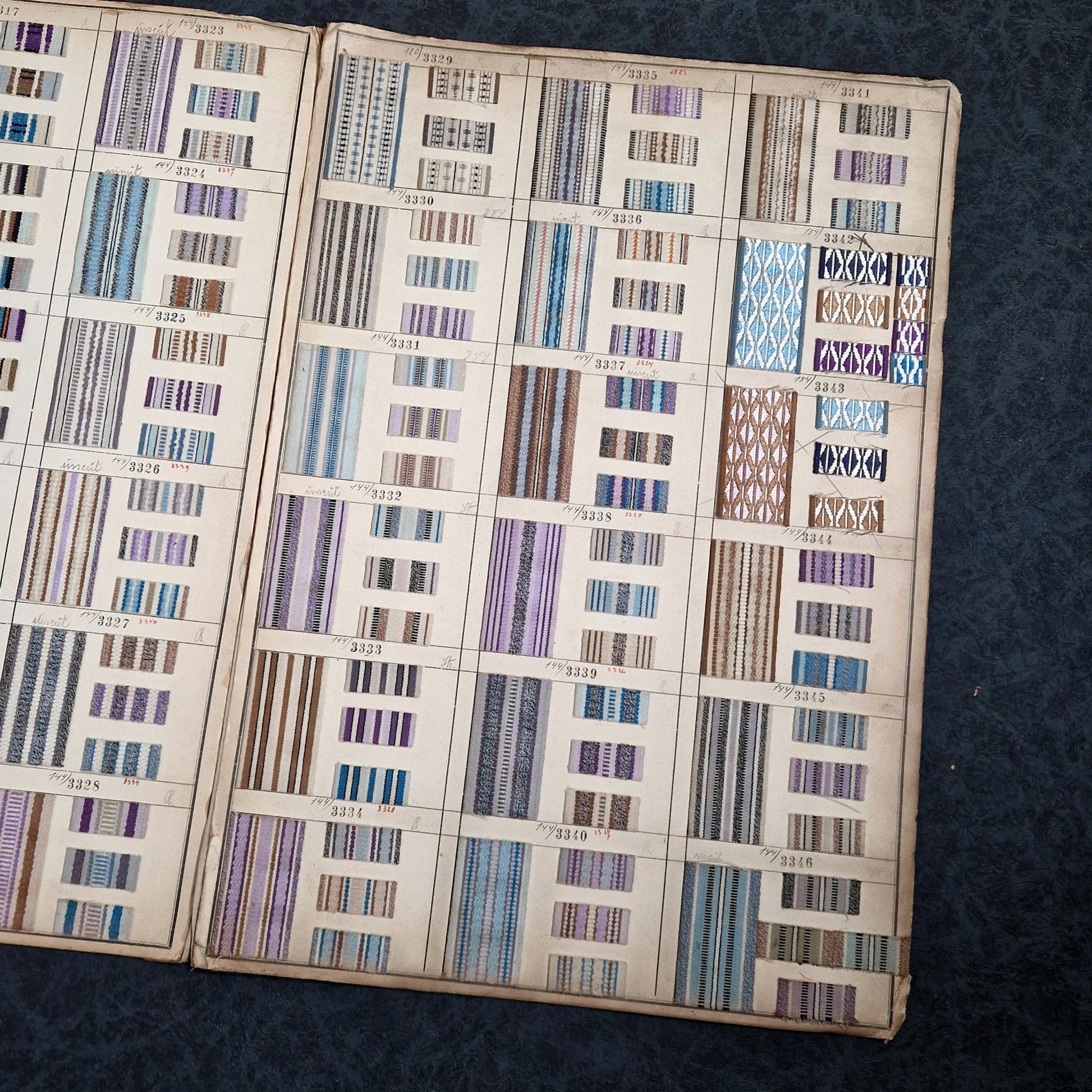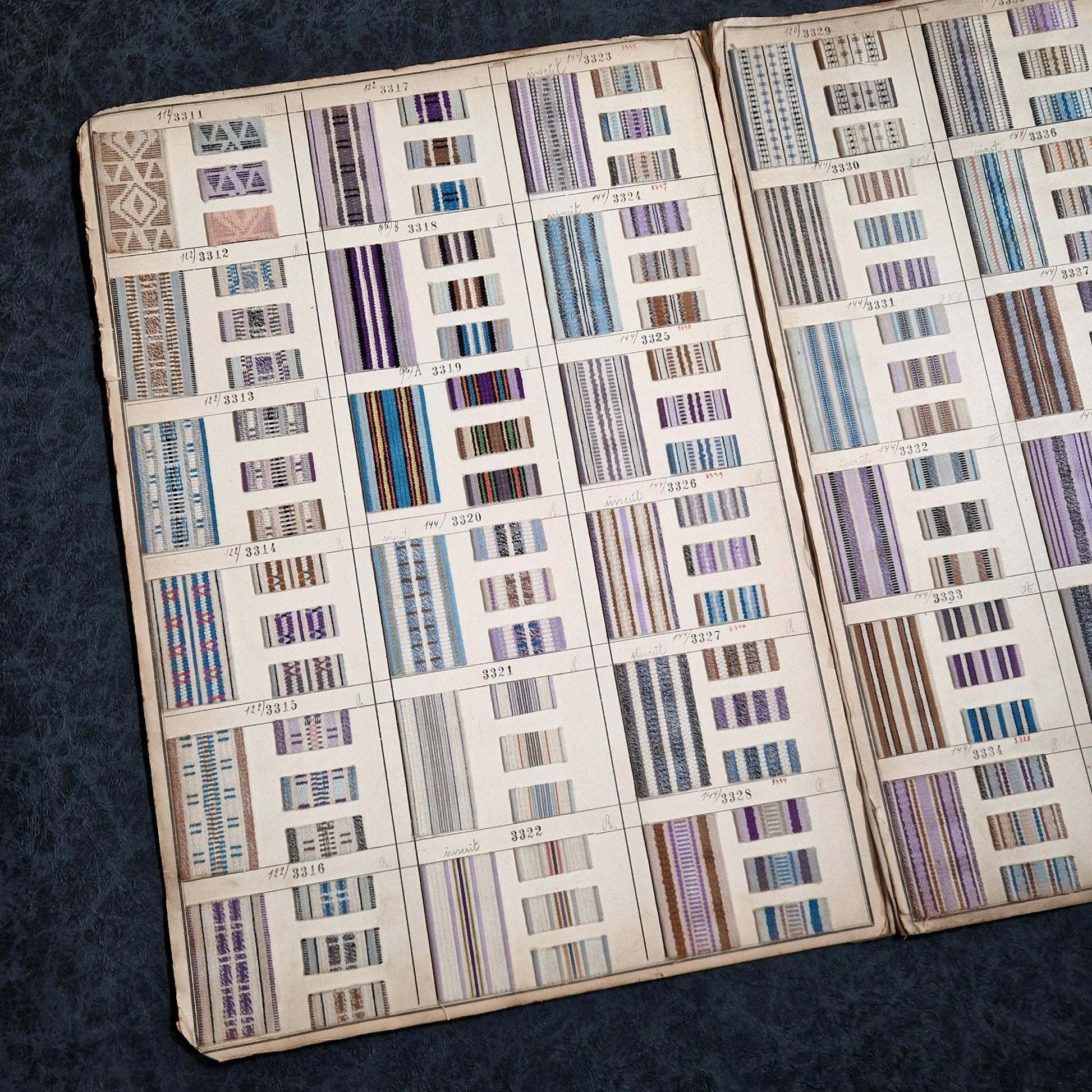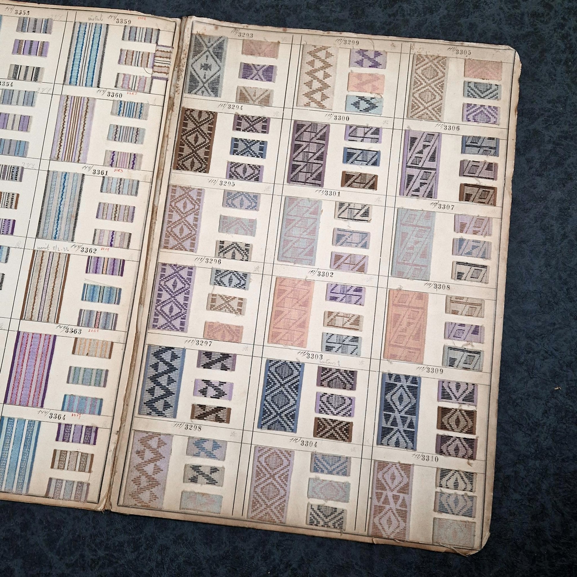 Planche textile ancienne dépliante présentant quatre pages organisées en grilles numérotées, offrant une grande diversité de motifs textiles mêlant rayures, compositions géométriques et recherches décoratives plus élaborées sur environ 290 échantillons. L’ensemble se distingue par une palette équilibrée de bleus, violets, bruns et tons neutres, avec une alternance entre motifs sobres et propositions plus graphiques, typiques des années 1920. Certaines bandes plus larges apportent du rythme à la composition et renforcent l’intérêt visuel global. Une pièce à la fois documentaire et décorative, particulièrement riche dans sa variété.