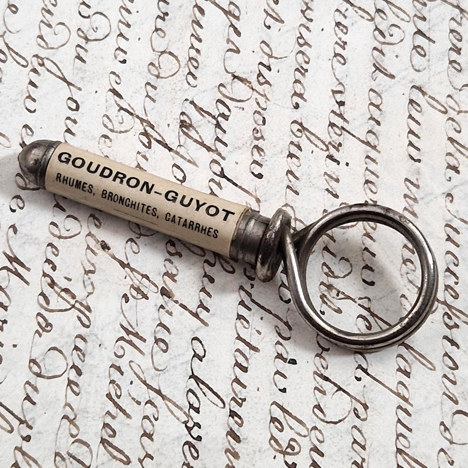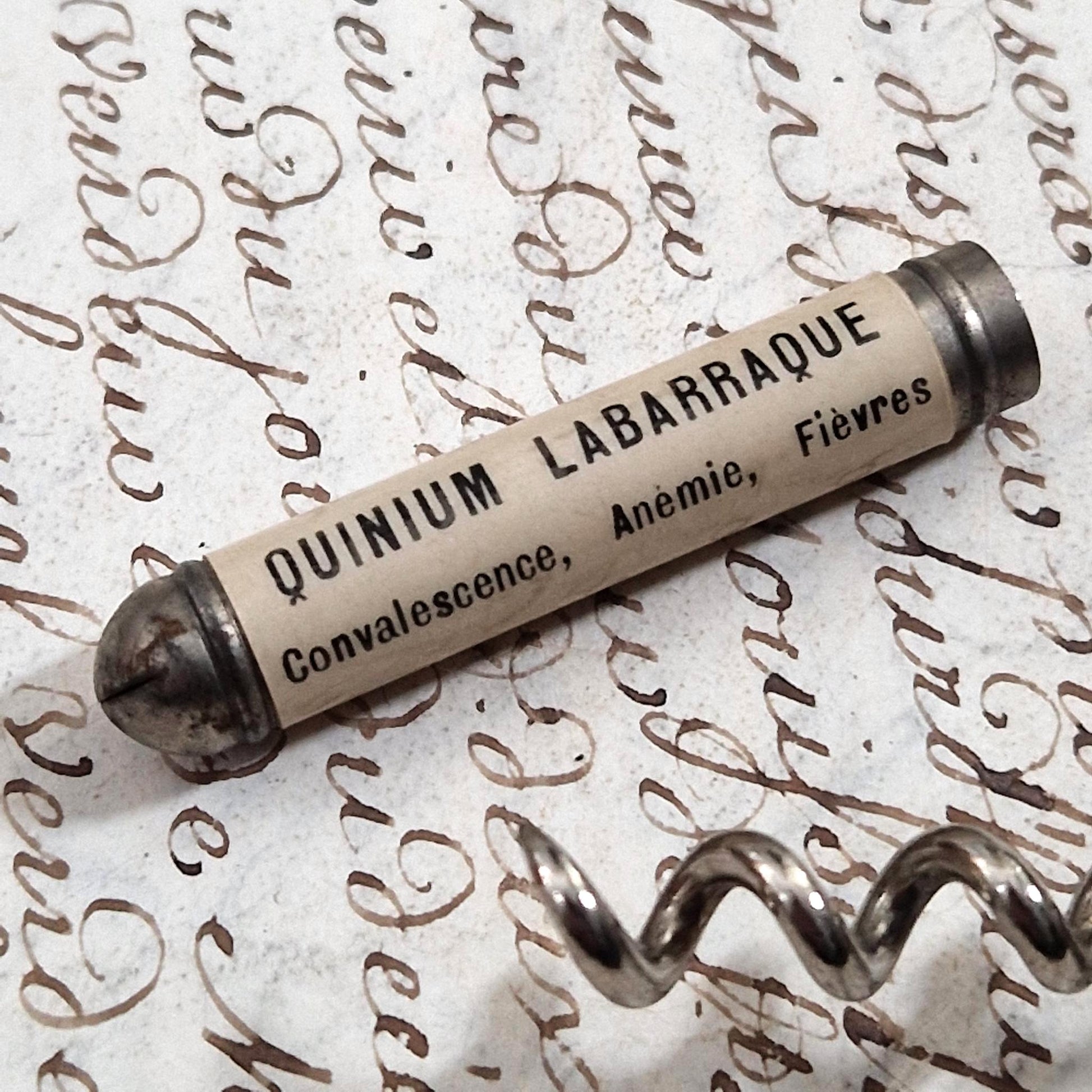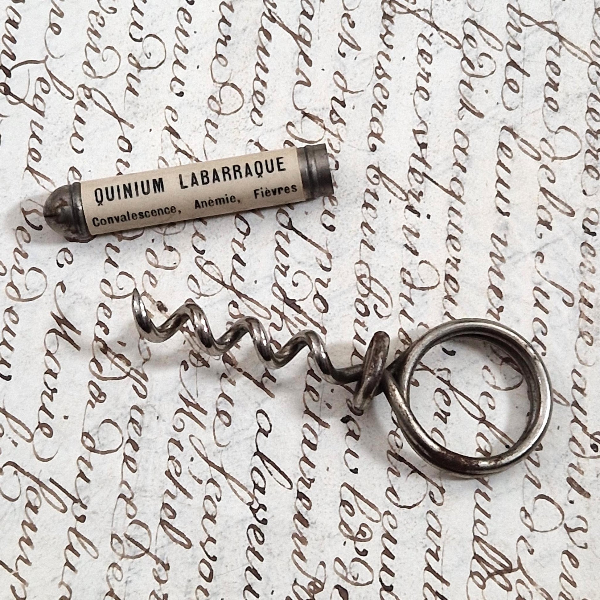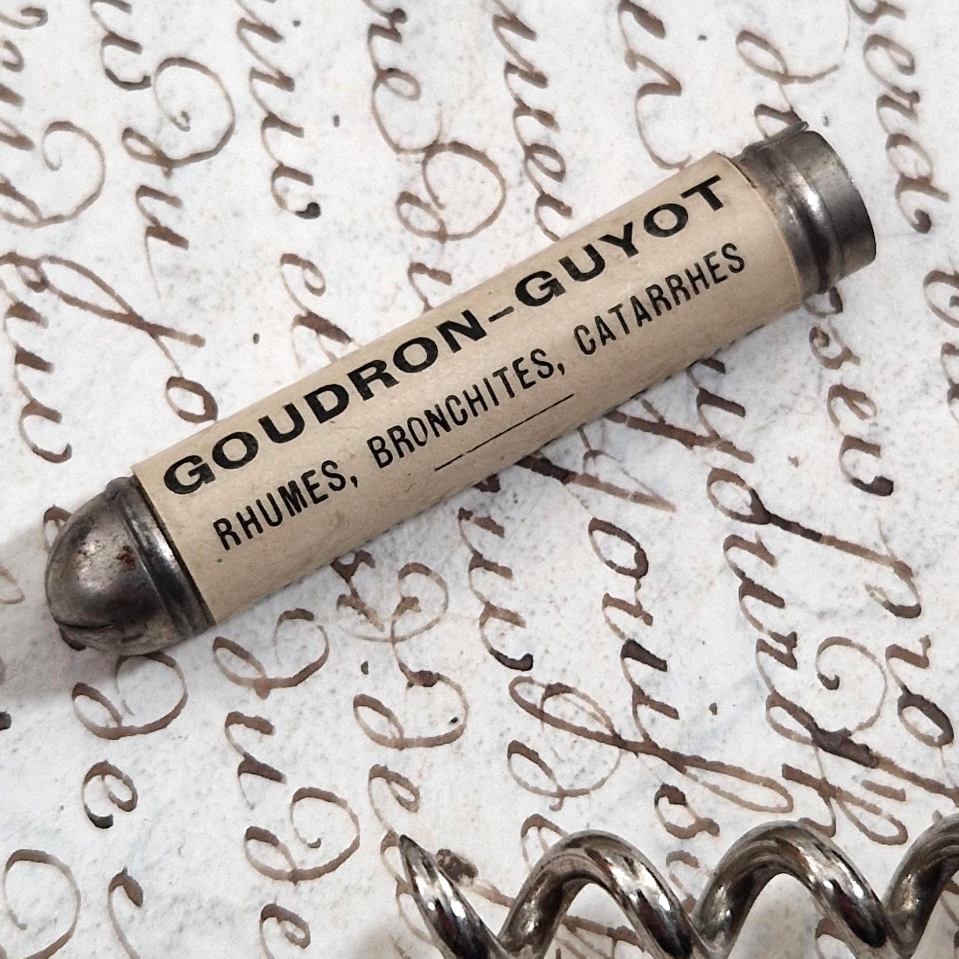 Tire-bouchon publicitaire de pharmacie datant de la fin du XIXe ou du tout début du XXe siècle, associant une mèche hélicoïdale en acier à un manche cylindrique gainé de papier imprimé. Ce type d’objet promotionnel était diffusé par les maisons pharmaceutiques afin d’ancrer leurs spécialités dans l’usage quotidien. Les mentions « Quininium Labarraque – Convalescence, Anémie, Fièvres » et « Goudron-Guyot – Rhumes, Bronchites, Catarrhes » illustrent parfaitement la pharmacopée populaire de la Belle Époque. Objet hybride entre utilitaire domestique et publicité médicale, conservé avec ses étiquettes d’origine et une patine cohérente avec son usage.
