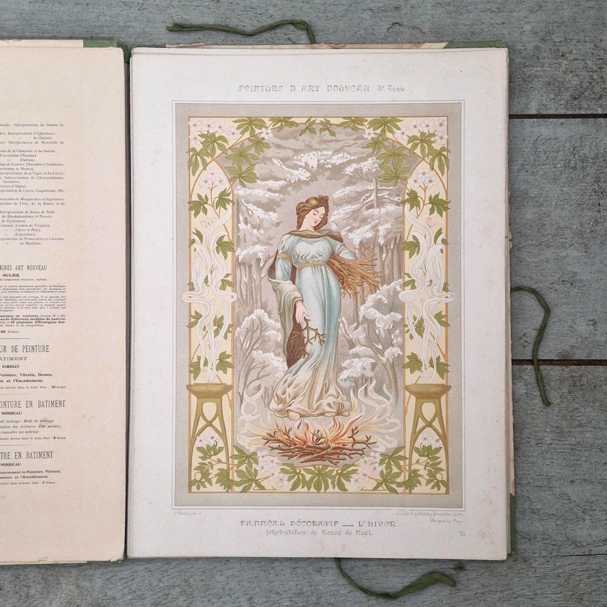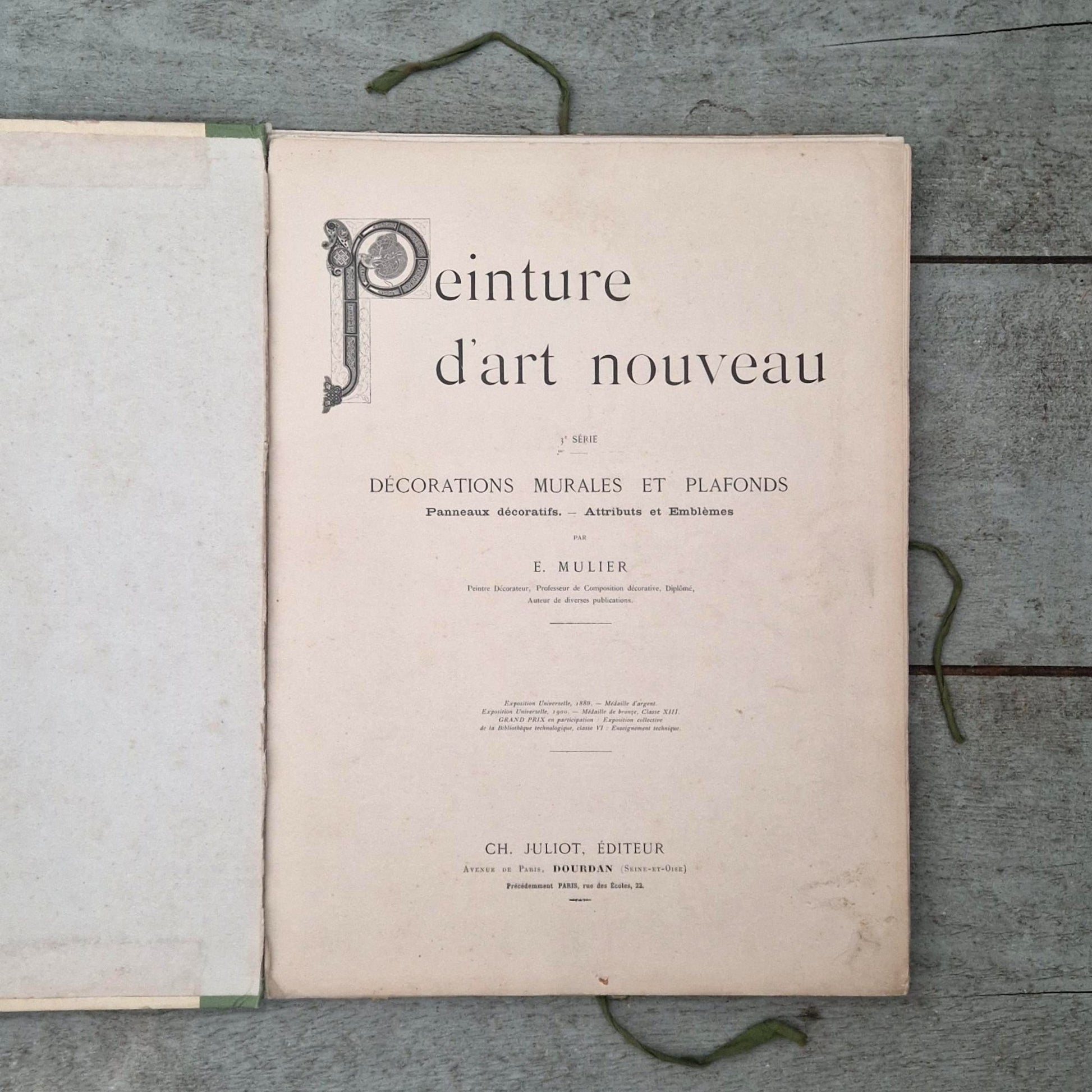Rare portfolio de modèles décoratifs Art nouveau destiné aux peintres décorateurs et artisans, intitulé « Peinture d’art nouveau - Décorations murales et plafonds », 3e série, par E. Mulier, édité par Ch. Juliot à Dourdan. Cet ouvrage propose des compositions prêtes à l’emploi pour panneaux muraux, plafonds, escaliers ou décors de cafés, dans le goût naturaliste et ornemental de la Belle Époque. Les planches, imprimées en chromolithographie de grande qualité, présentent figures féminines allégoriques, motifs floraux, instruments de musique et compositions architecturées caractéristiques de l’Art nouveau français vers 1895-1905. Ouvrage très décoratif et recherché pour l’encadrement ou l’étude des arts décoratifs, les portfolios de ce type ayant été souvent dispersés ou utilisés en atelier, ce qui explique la rareté des ensembles conservés.